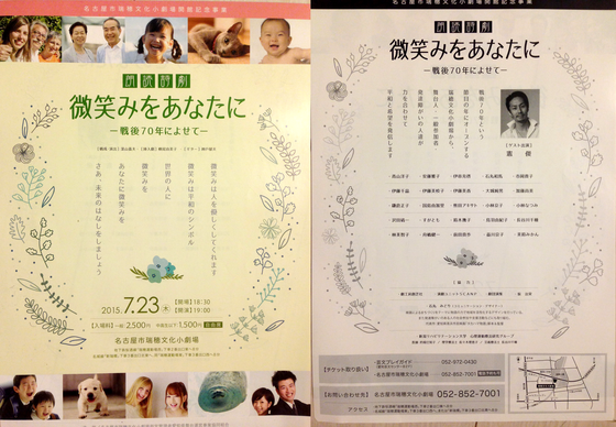 2015/06/01 00:47本日も稽古!その最中に、7月23日上映会のちらしが届きました! タイトルがすこ〜し変更になり、「微笑みをあなたに」ー戦後70年によせてー 戦争中の辛い詩や特攻隊員の辞世の句、平和を祈る詩などで構成されています。読みながらついつい涙を流す人も。戦後70年という今年、もう一度「平和」について考えてみたいですね。 ゲストとして、名古屋おもてなし武将隊初代信長役の「憲俊」さんも出演します。 発達障がいのある人、舞台人、一般参加者が力を合わせて創る朗読劇。そして、ドキュメンタリー制作はまだまだ続きます!あと24時間となってしまいました!どうぞご支援お願いいたします。 もっと見る