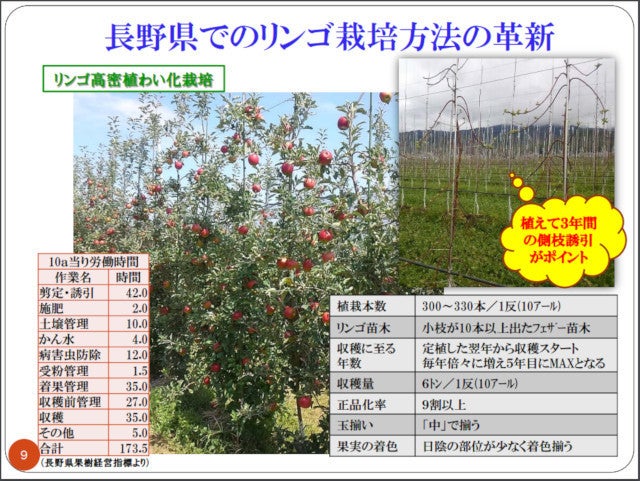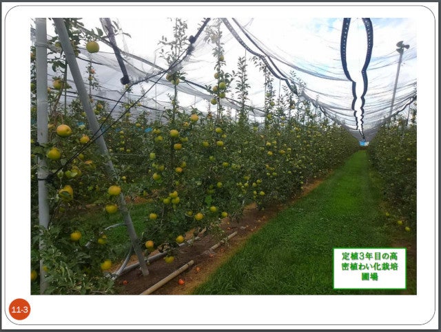 「生食用ではなく加工用を前提としたりんごの栽培(新わい化高密植栽培)」