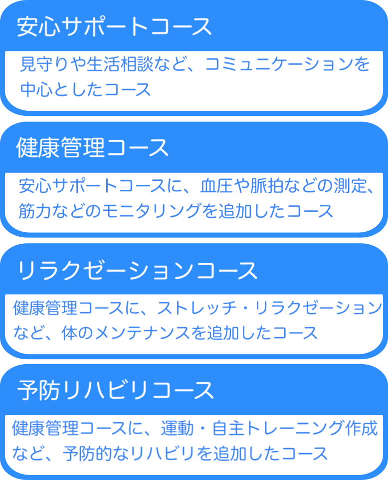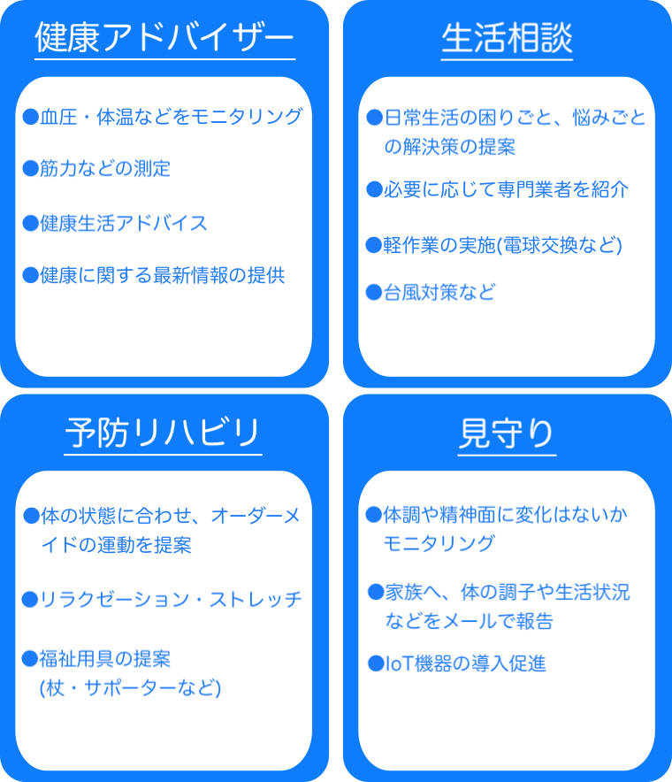 ご自宅へ訪問し、「健康」「生活相談」「予防リハビリ」「見守り」を提供します。