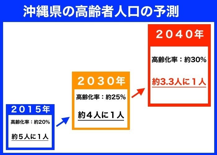 国勢調査によると、出生率の高い沖縄でさえ2015年には人口に占める高齢者の割合が25%、2040年には30.3%と見込まれ、全国の高齢化率よりも若干低いものの、今後増加傾向で推移すると予想されているのです。