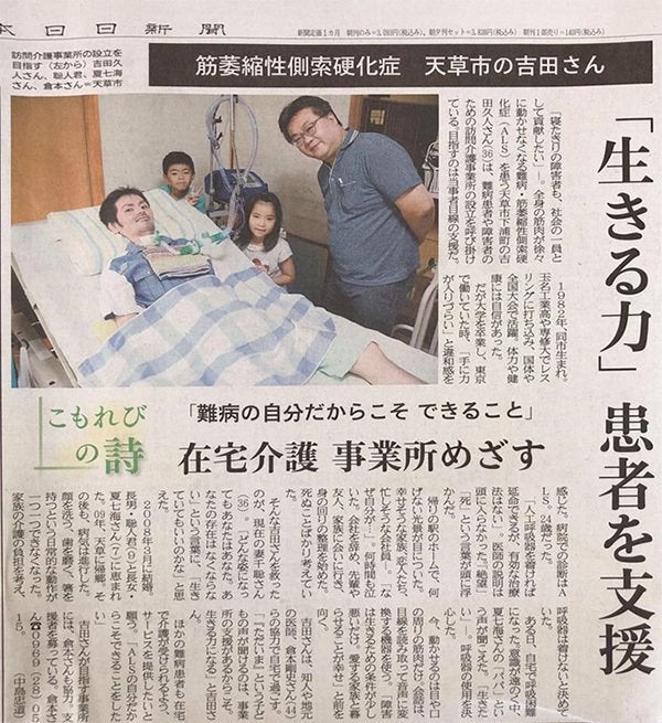 天草にはALS患者、難病を抱えている患者はたくさんいらっしゃいます。重度訪問介護の普及、訪問介護事業所設立は障がい者や、その家族の希望の光になります。
