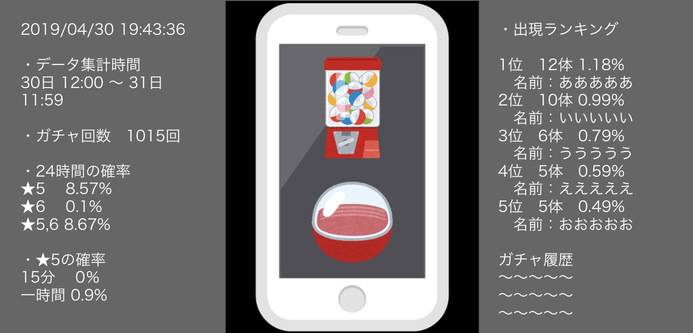 検証は、ご覧頂いたとおり基本的に24時間連続で進めており、排出されたキャラをレア度毎、ランキング順、履歴など様々な方法で結果を視聴者の方に届けています。これによってユーザーは現在のガチャ排出率を知ることができるため、安心してガチャを利用することができます。