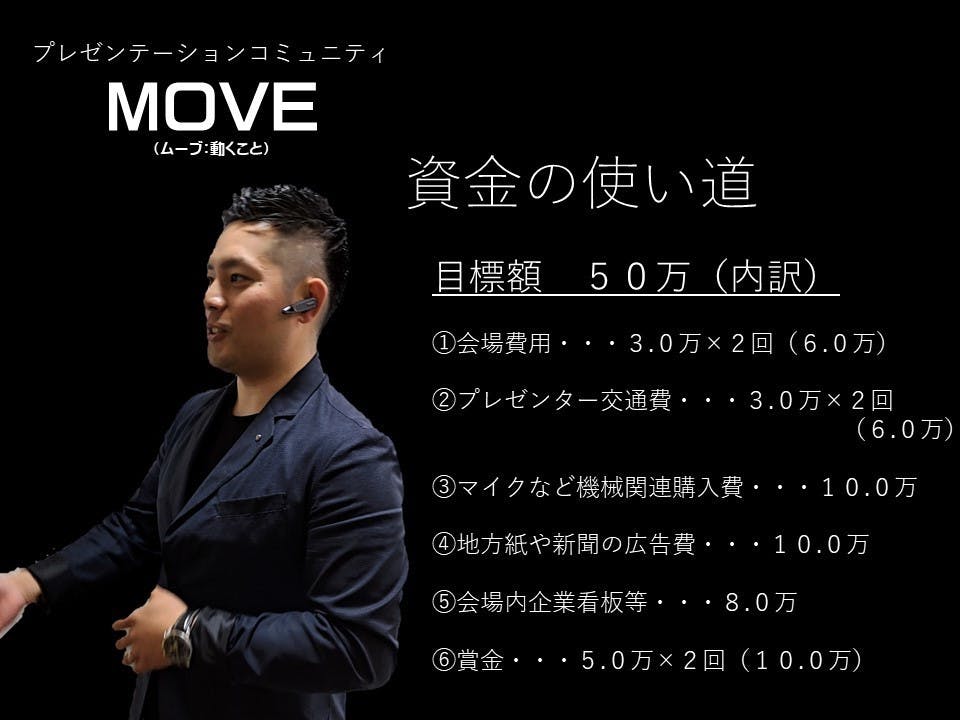 2019/06/27 20:35達成しました!!やったーーーーー!!最高に嬉しいです!!応援いただきました皆様、ご支援いただきました皆様、陰ながら支えてくださったスタッフの皆様、直接の応援の言葉をかけてくださった皆様、この多忙を極める期間を支えてくれた家族に、本当に感謝感謝感謝しています!!本当に嬉しいです!今からプレゼンテーションコミュニティ「MOVE」事業立ち上げに全力を注いでまいります!また経過報告をさせていただきます!残り4日間あります!今から先のご支援につきましては、事業の回を増すごとに、行政や大学等への協賛依頼に回ります!その際の交通費や広報費等に当てさせていただきます!持続的に地域のコミュニティであり続けるための工夫を取り組んでまいります! もっと見る