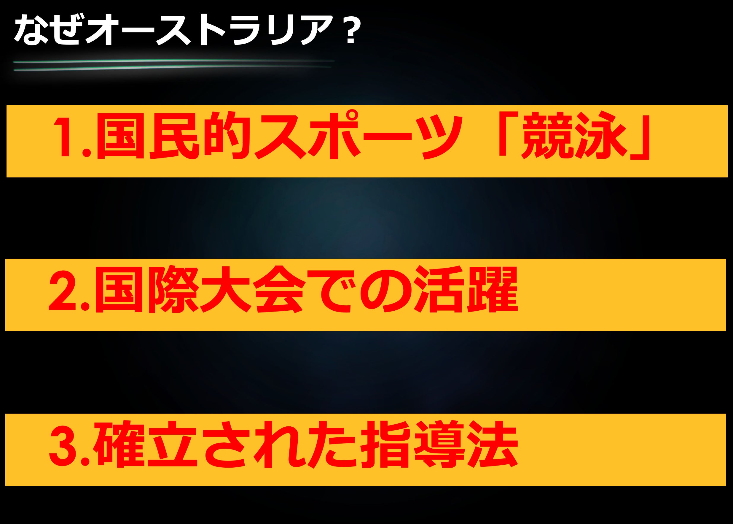 オーストラリアの国際大会での活躍の裏には、確立された指導法や施設があります。その例として、競泳オーストラリア代表監督であるピーター・ビショップコーチをはじめとした「長所を伸ばす」コーチングや、