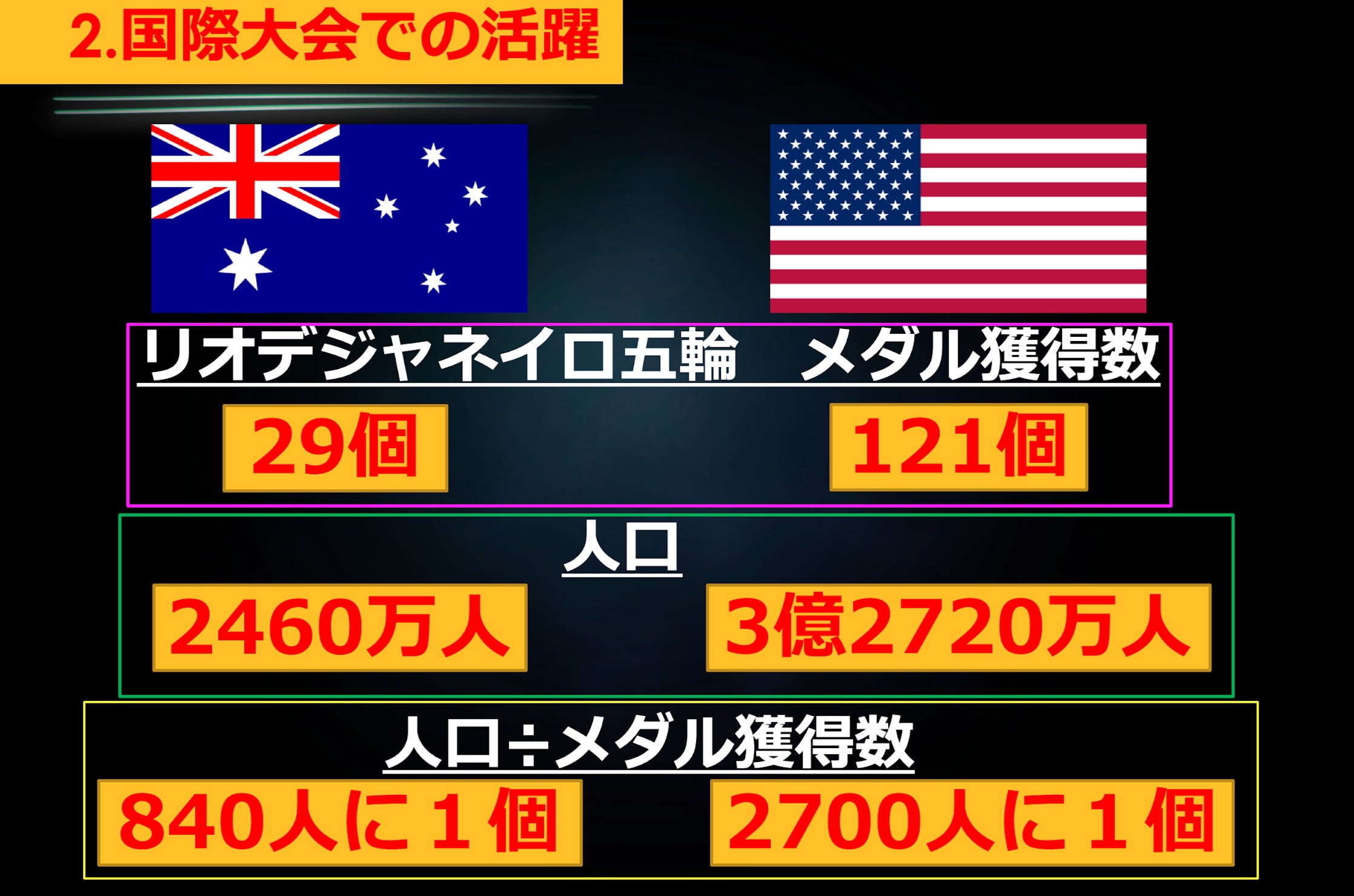 上のスライドはリオデジャネイロオリンピックでのメダル獲得数、各国人口、人口÷メダル獲得数を簡単にまとめたものです。単純にメダル獲得数だけを見ると、オーストラリアはアメリカに負けています。しかし、アメリカはオーストラリアより13倍もの人口がいます。それだけの人口を有していればメダル獲得数が勝るのも必然でしょう。しかし、 人口÷メダル獲得数でご覧いただくと、オーストラリアの実力が見えてきます。オーストラリアは人口に対して多くの選手がメダルを獲得しています。このように、オーストラリアは多くの選手をメダリストとして成長させる力を持っているのではないでしょうか。
