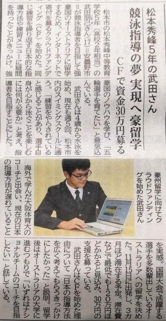 こんにちは!日々、私の活動にご理解いただきありがとうございます!先日(10月9日)の信濃毎日新聞の朝刊に本プロジェクトが掲載されました!多くのみなさまにお声がけをいただき、改めて「コーチング留学」への意欲が湧いてきました。ありがとうございます!!!また、本プロジェクトを取材いただいた記者の方に改めてお礼申し上げます。みなさまの温かいお言葉やご支援をいただく度に、涙が溢れる想いでおります。みなさまのご期待に応えられるように、留学がより良いものとなるように、さらに準備を進めていきます。※プライバシーの都合上、本プロジェクトが終了しなければご支援者様の情報を確認することができません(>_<)ですので、現時点ではこちらから個別にメッセージを送ることができていません。申し訳ありません。残り1ヶ月でクラウドファンディング が終了します(11月12日終了)。「今回のクラウドファンディングを通して日本の指導について考えるきっかけにしたい」そのように思っているからこそ、多くの方に知っていただきたく思っております。みなさまにも可能な範囲でそのお手伝いをしていただけましたら幸いです。(SNSでの拡散や知り合いへ紹介をしていただくだけでも本当にありがたいです!)朝昼の寒暖差が激しくなってきた季節ですが、どうぞお体にはお気をつけくださいませ。武田 朋己