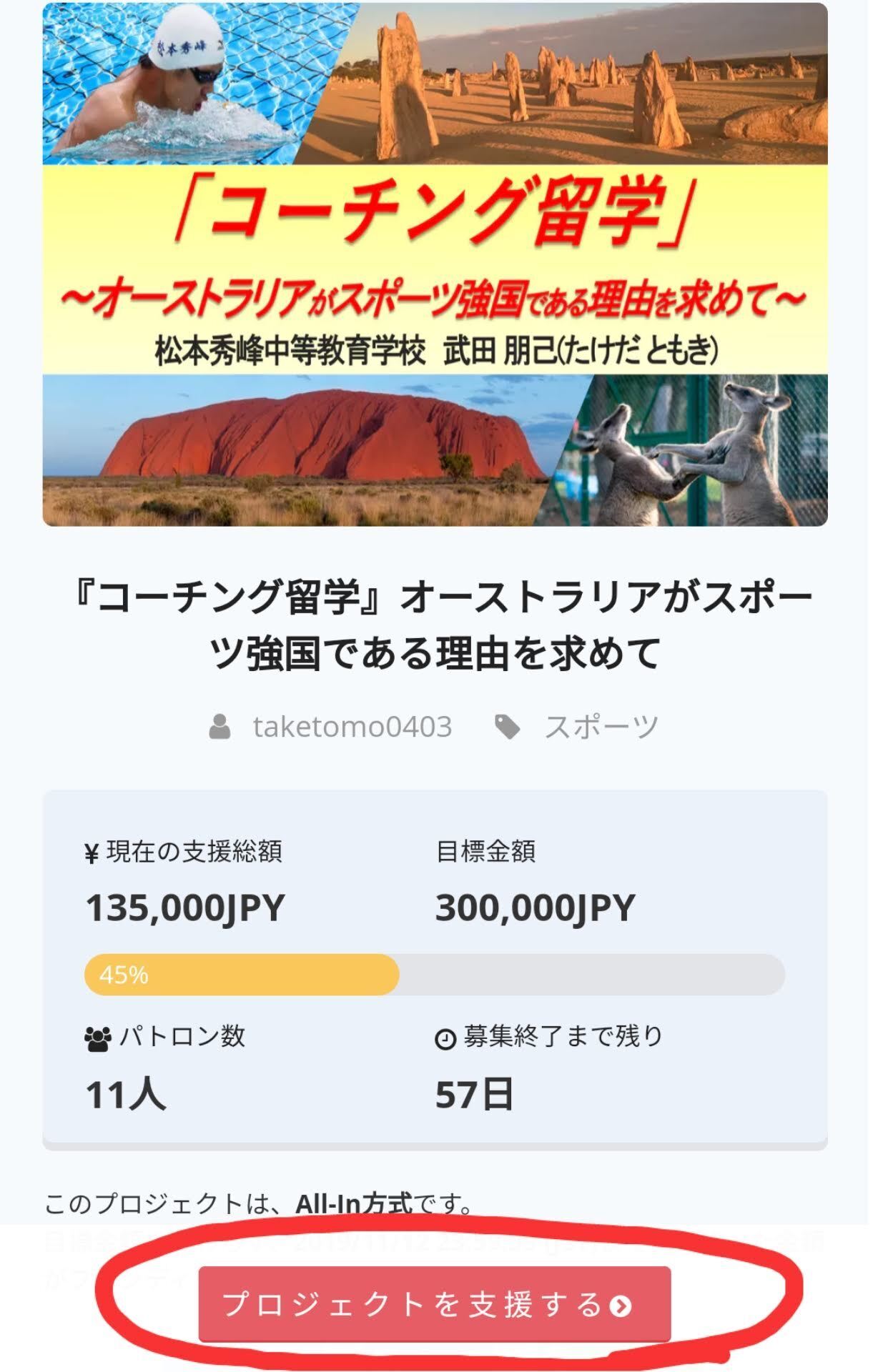 ①「『コーチング留学』オーストラリアがスポーツ強国である理由を求めて」のプロジェクトページから「プロジェクトを支援する」を選択します。または、リターンを選択します。(ご支援にあたり、会員登録は必要ありません。お気軽にご支援いただくことができます。)