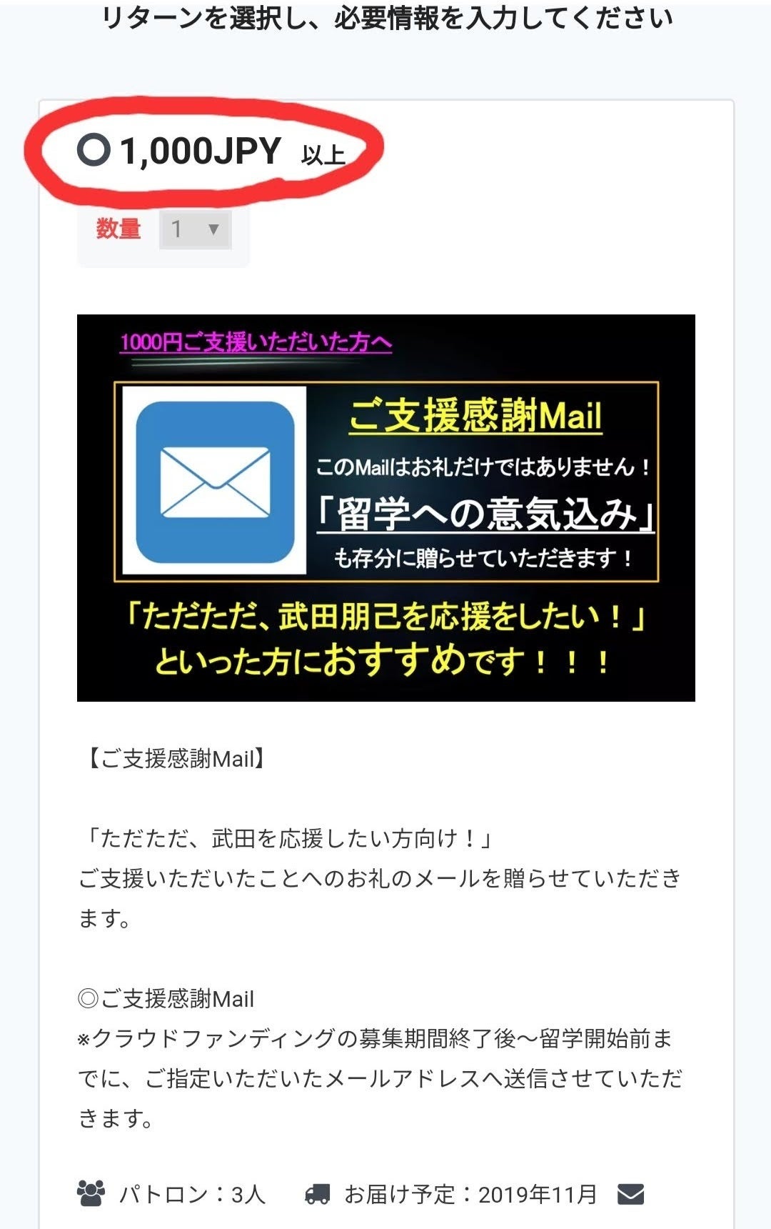 ② 「プロジェクトを支援する」をクリックしていただいた方は、次にリターンを選択します。赤丸で囲んだ範囲をクリックすることで選択することができます。