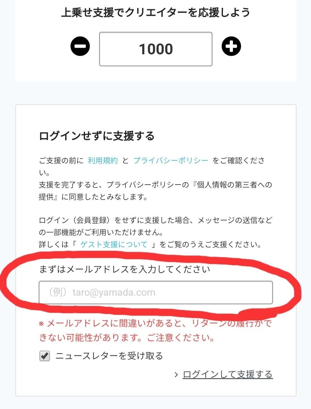 ログインをされていない方は、連絡のつくメールアドレスの入力をお願いいたします。リターンを実行する際に、こちらのメールアドレスを使用いたします。メールアドレスは本プロジェクト以外の用途では使用いたしませんので、ご安心ください。