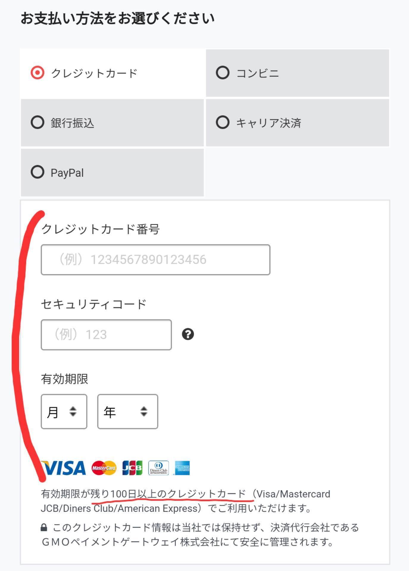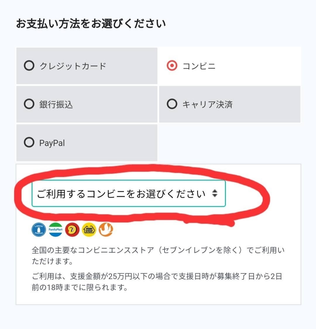 ④ お支払い方法を選択します。「クレジットカード(使用期限が100日以上)」「コンビニ支払い」「銀行振込」「キャリア決済(電話料金とともに引き落とし)」「PayPal」の5種類の決済方法を選択いただけます。なお、決済手数料はご支援者様のご負担となります。何卒ご理解のほどよろしくお願いいたします。