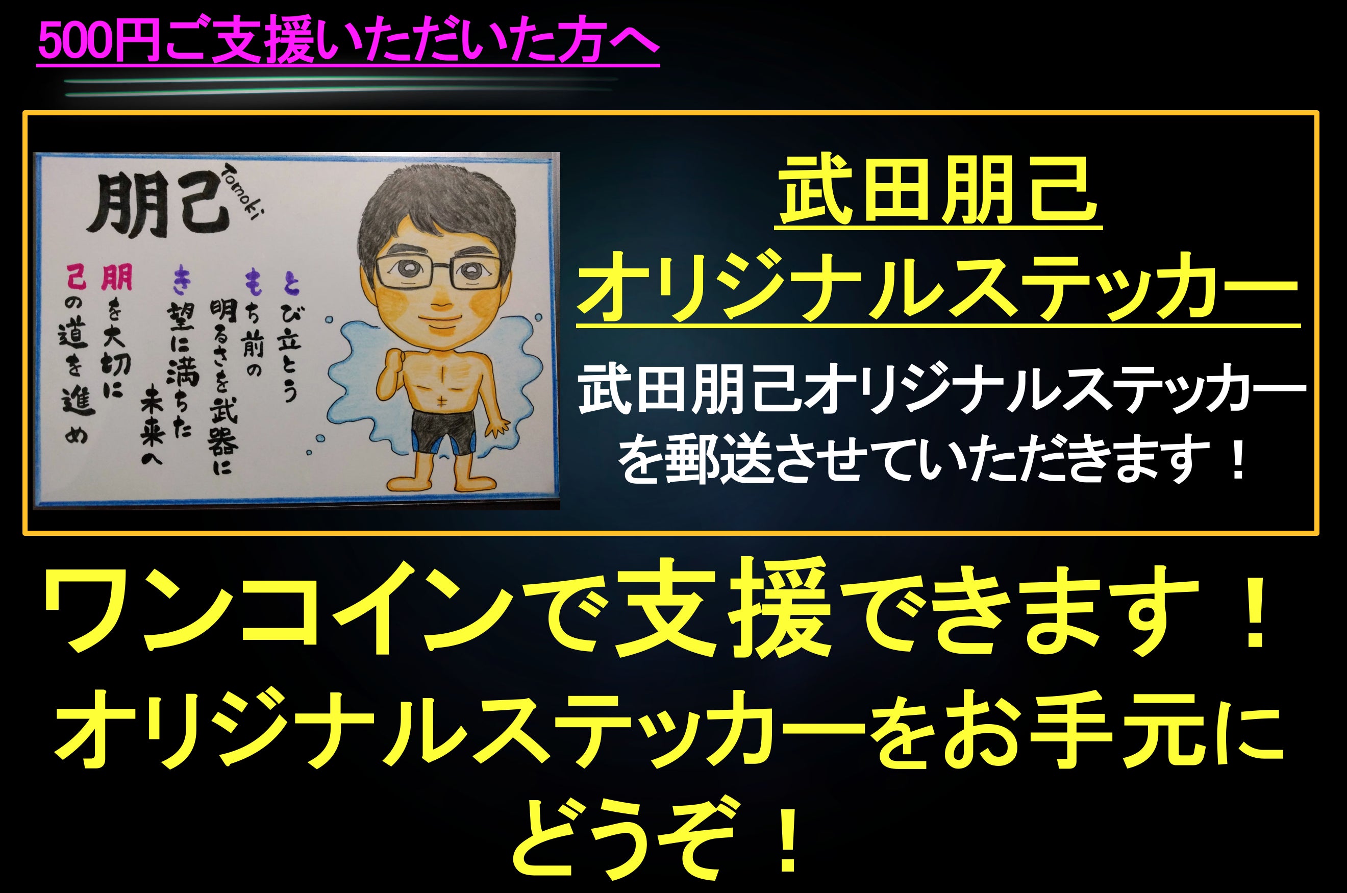こんにちは!先日ある方がに「ワンコインで気軽に支援できるリターンはないの?」と尋ねられました。1000円は出ないけど...500円くらいなら。ということで、ワンコインでご支援いただけるリターンを追加しました!そして、注目のリターンは!!!「武田朋己オリジナルステッカー」です!以下の写真のデザインになります。私は、「ともき」という名前にちなんだ詩をとても気に入っています。一家に一枚「武田朋己オリジナルステッカー」はどうでしょうか?引き続き、ご支援ご協力のほどよろしくお願いいたします。※「武田朋己オリジナルステッカー」は500円のリターンだけでなく、全てのリターンに共通して配布しております。1000円(Email),2000円,3000円のリターンを選択いただいた方へは、こちらから希望の送付先をお尋ねします。その他のリターンを選択された方へは、ご入力いただいた住所へ送付させていただきます。ご覧いただきありがとうございました!ご不明な点がございましたら、taketomo040304030403@gmail.comまでご連絡ください!武田 朋己