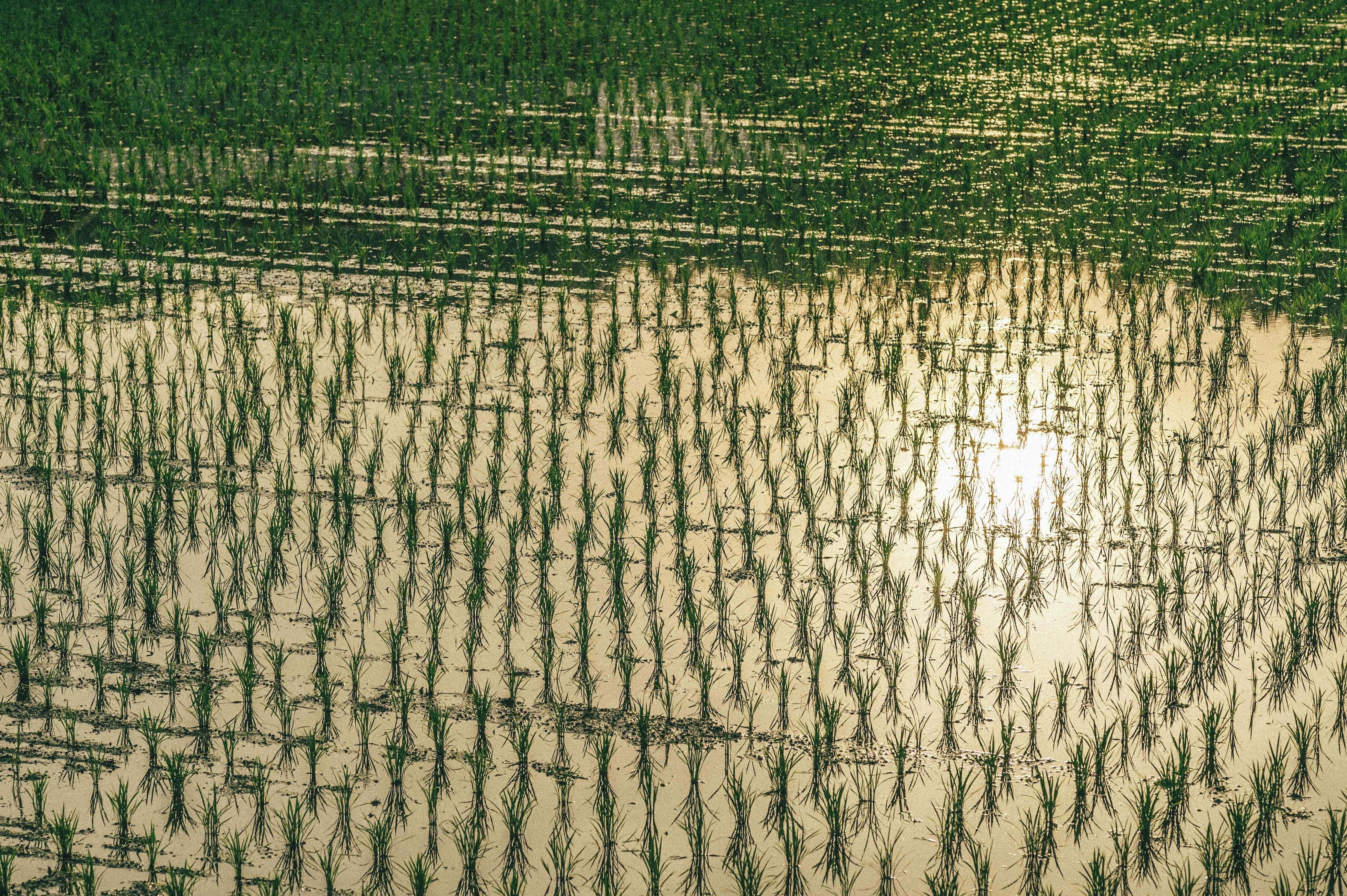 田んぼに反射する夕陽。(5月26日撮影、古民家近く。)