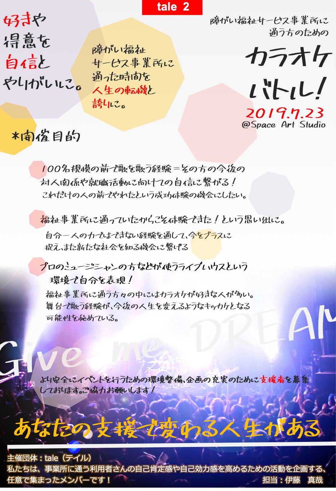 また私自身も経験のない、ミュージシャンなどが舞台として使うライブハウスという設備の中で自分を表現できたら、その方の今後の人生を変えるようなキッカケとなる可能性を秘めている。