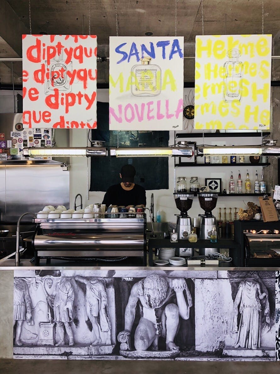 例えば、店舗デザインとして描いた女性の服装やヘアメイクが、シーズンごとにトレンド を加味しながら変化。アートを通して今のシーンが一目で分かり、