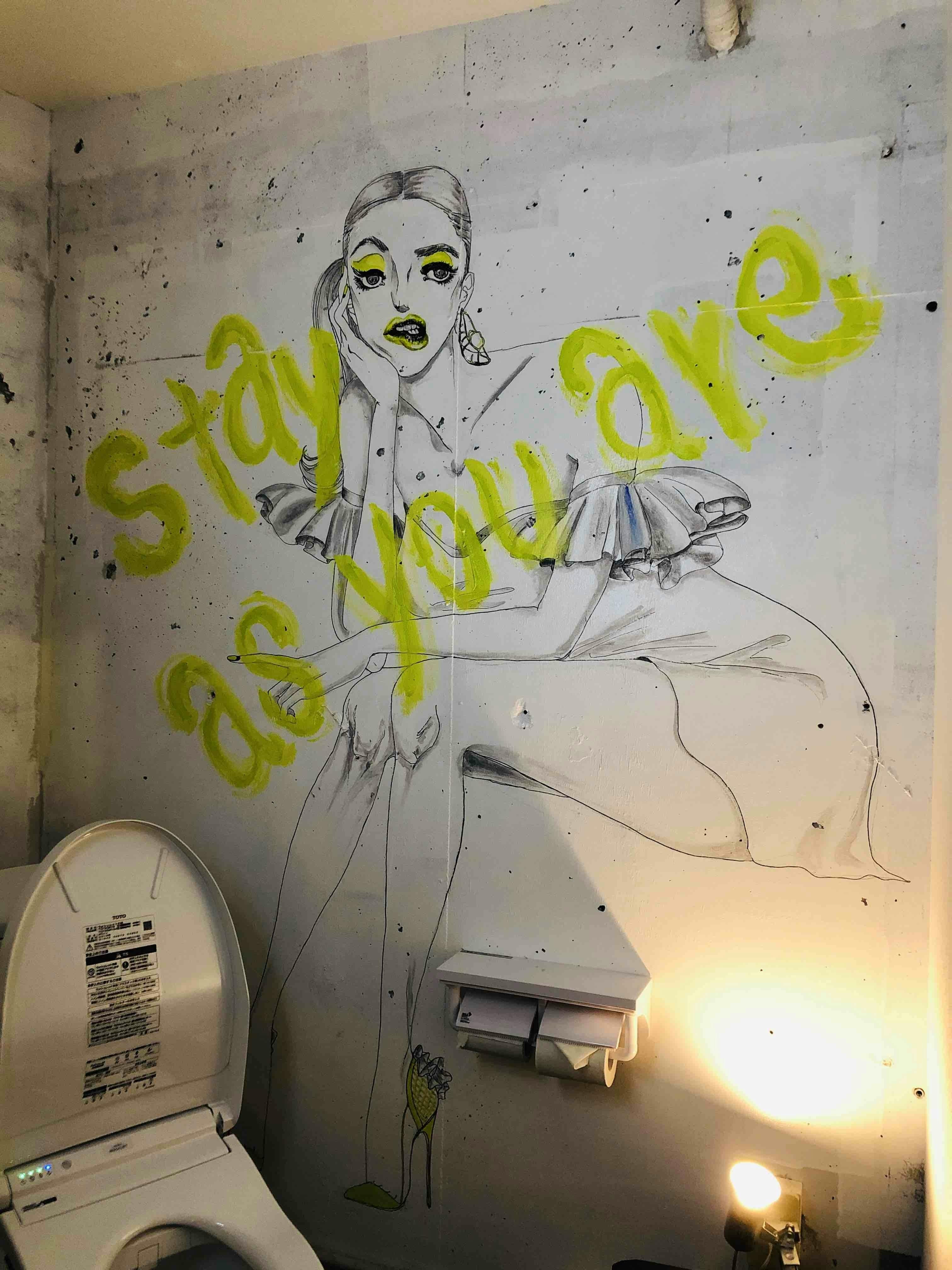↑トイレでお酒のおかわりをお誘いするお姉さまと、その左手が指し示す先の壁に、
