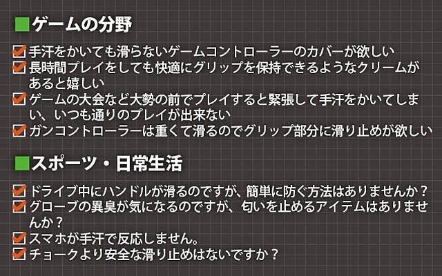 お客様一人ひとりのご要望にお応えするため、ゲームだけではなくスポーツやアウトドア、またはお気軽に日常生活で使っていただけるような快適な滑り止めクリームを作りたいとの想いから、開発に2年を要し改良を重ね、ついに完成いたしました。