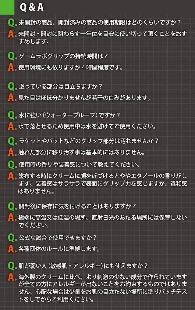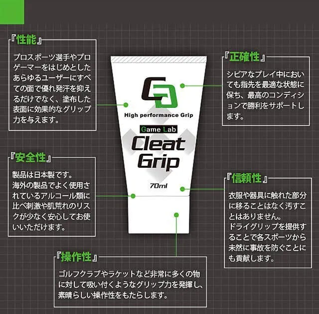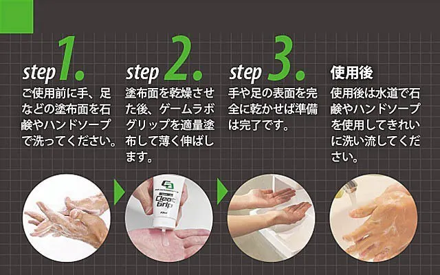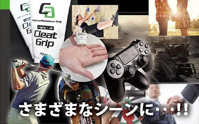 ゲームラボグリップは塗った直後から汗による手足の滑りや不快感を無くし、強力なグリップ力で最大の効果を発揮し、ゲーム、スポーツ、日常生活の様々なシーンで活躍します。