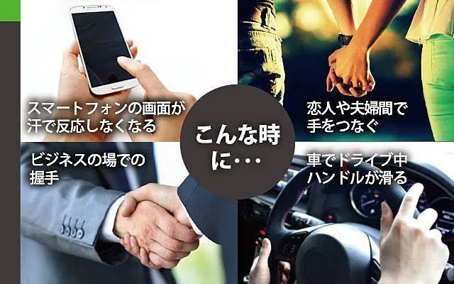 何気ない日常生活、職場、取引先の中で手汗のべたべたが原因で相手を不快に感じさせてしまったり、車でドライブ中ハンドルが滑り危険に感じたことはありませんか?ゲームラボグリップは見た目や使用感にも配慮し、周りを汚さず、さらっとして長時間発汗を抑えてビジネスや日常の何気ない手汗対策が簡単にでき、手は爽やか清潔に保ち手をつなぐことや握手の自信に繋がります。