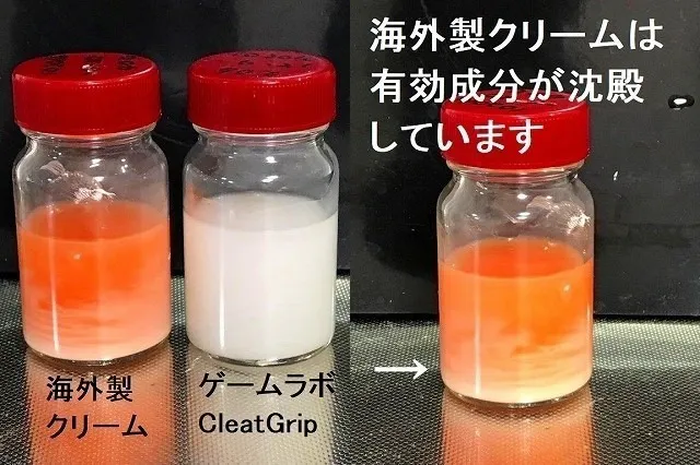 こちらは実際に海外の滑り止めクリーム(オレンジ)とゲームラボグリップ(白)の有効成分を比較したものです。
