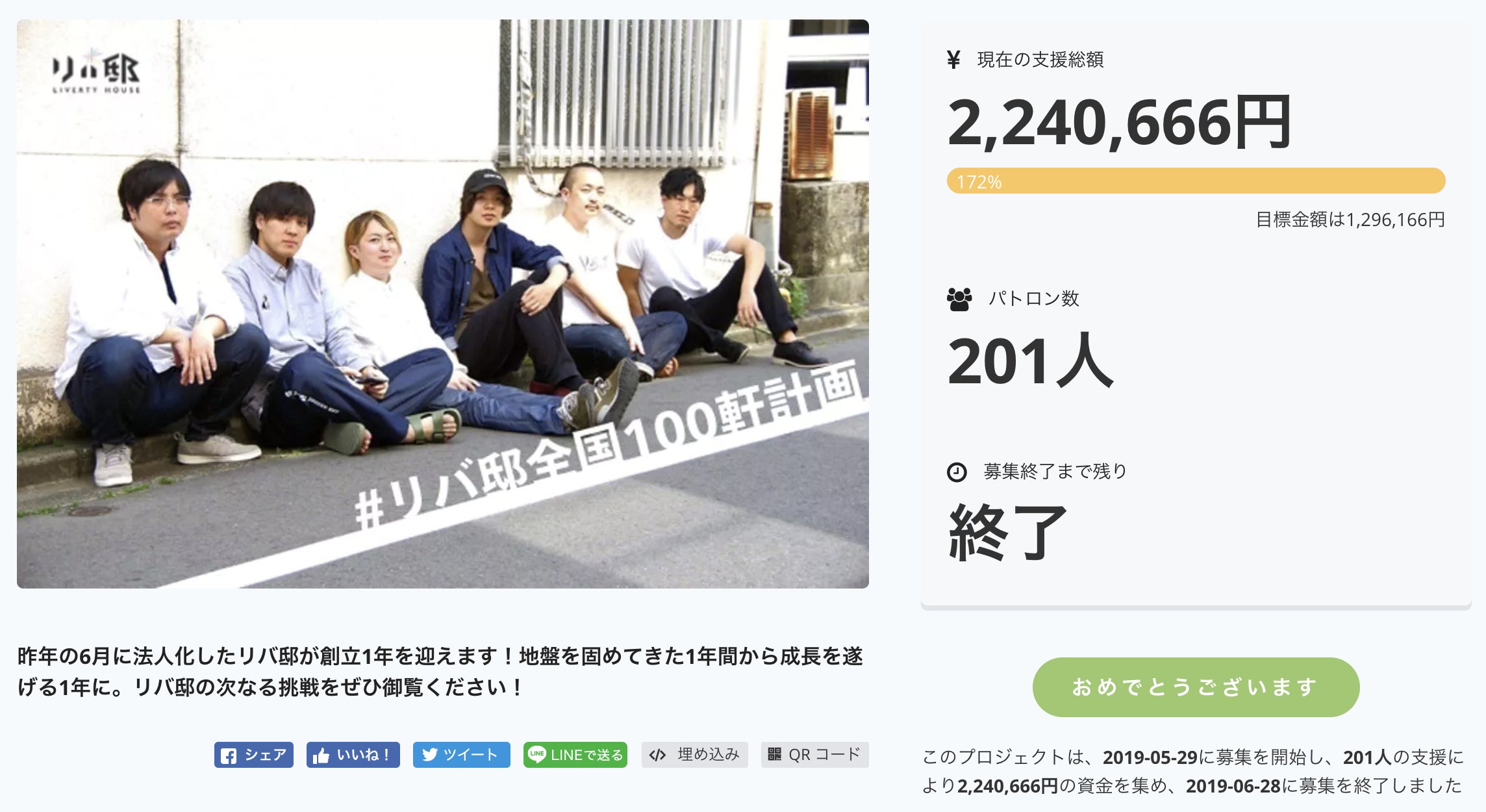 昨晩の23時59分59秒で、今回のプロジェクト「【創立1年】#リバ邸全国100軒計画!友達と遊ぶようにリバ邸を作り続けたい!」が終了致しました。