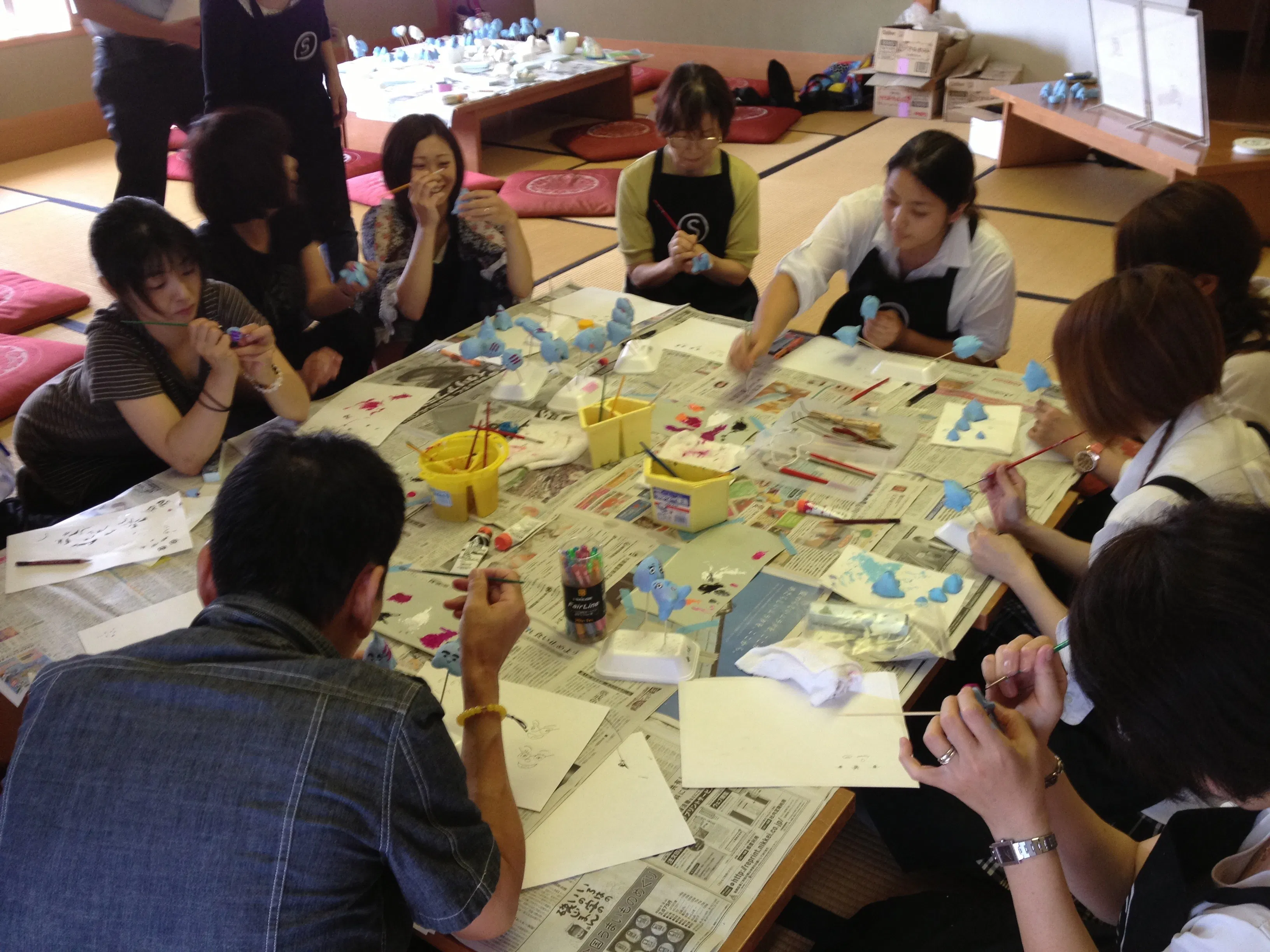 私自身、団体行動が苦手な割には、意外と大勢で何かを作ることも好きなようです。こちらは道後オンセナートというアートフェスティバルで、地元の商店街の方々とアニメ制作をした時のもの。温泉のキャラクターが主役のアニメで、それぞれのキャラに自分の顔を描いてるところです。→アニメーション『ゆだまん』