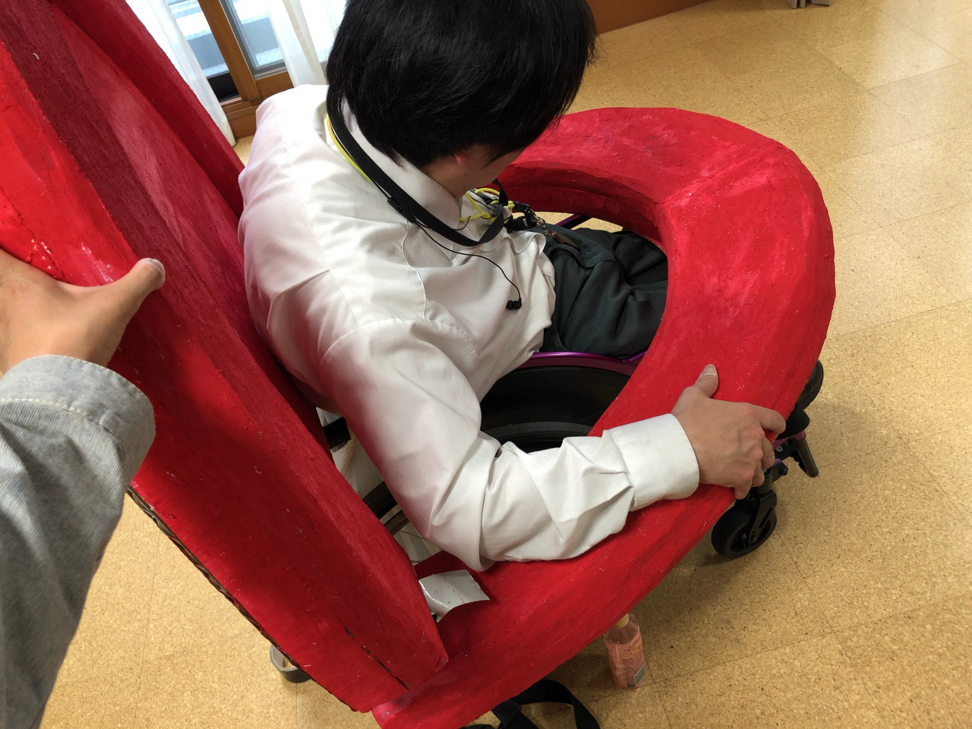 一人一人の車椅子は作りや大きさが少しずつ違います。体の機能に合わせて車椅子を特注する人もいます。付随運動(自分の意思とは無関係に体が動くこと)で手が出てしまう人は、その分余裕をもった大きさを計算します。車椅子を押す人が必要な人は、押す人の邪魔にならないような形を考えます。全部で10台分の車椅子につける装飾物を制作します。
