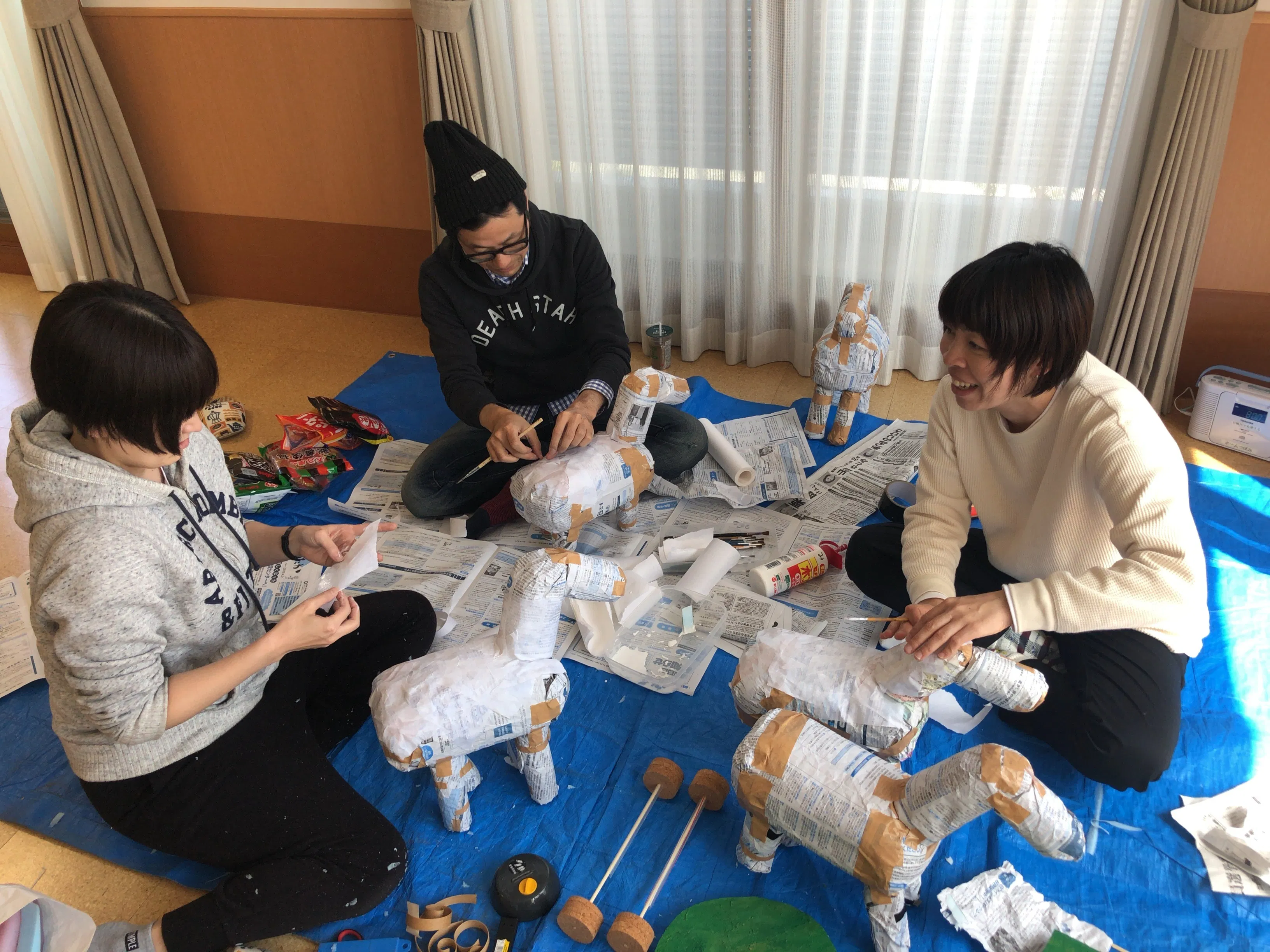 一人一人の趣味や好み、希望を聞いて話し合い、数人の友人の協力の元に制作しています。予算が無いので、なるべくダンボールや発泡スチロールなど、身近にあるものや要らなくなったものなど使用します。が、各作品のテーマにピッタリな素材が全部手元にあるわけではなく、10台分の材料費は大きいです。特に布の値段にはビックリ!