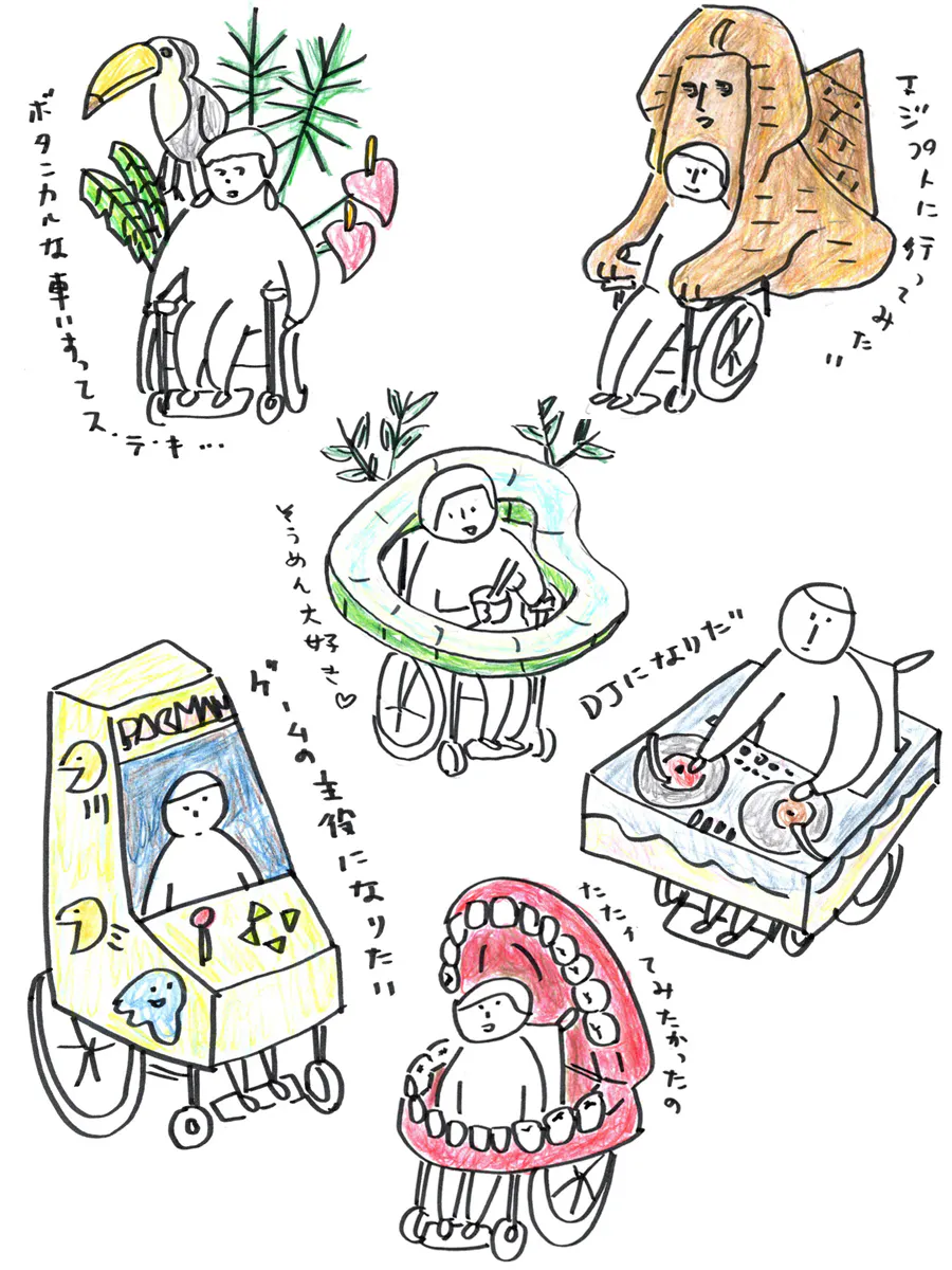 「いつか私も車椅子に乗るのかなあ?乗るとしたらどんな車椅子がいいかなあ。どうせなら好きなものに囲まれたいな〜」