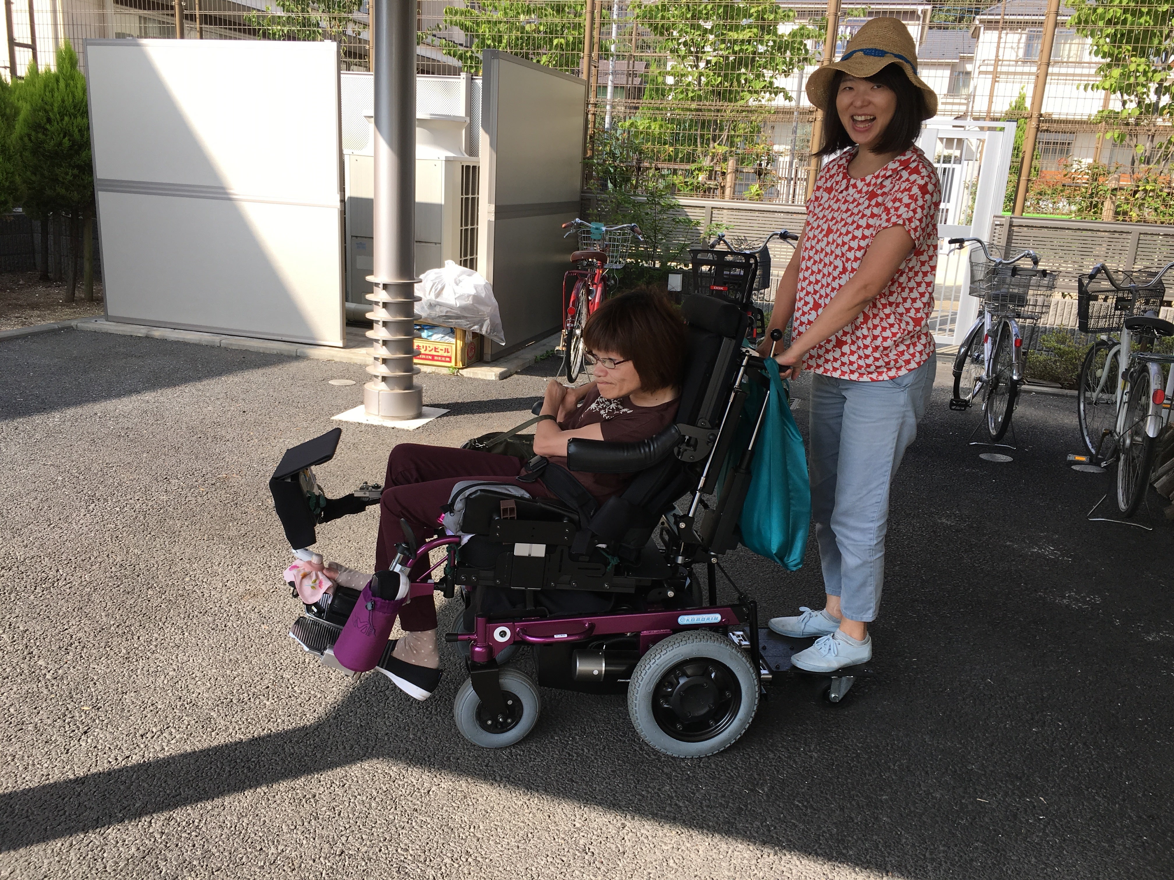 ヘルパーの仕事とは、障害者の日常生活の手助けです。食事介助や入浴介助のような日々の仕事から、車椅子を押して一緒に買い物をしたりします。人それぞれ必要な介助が違い、ご自分でできることは自分でされます。この写真の方は足の指でレバーを挟んで電動車椅子を運転します。一見、私が車椅子を押しているように見えますが、実際は後ろのステップに乗せてもらっています(笑)。
