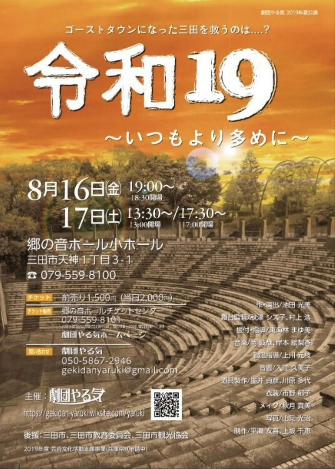 2019/08/16 00:37台風の影響で…ってのは昨日のブログでも書きましたが、結局50分程度照明合わせをさせてもらって強制帰宅となりました。夕方には家でゴロゴロしてるって、本番前日とは思えない〜!!身体は楽だけど超焦る〜〜!!!劇団やる気制作のヒラセトモキです!今年のお芝居「令和19〜いつもより多めに〜」の活動報告ブログ、楽しんでいただけましたでしょうか?これまでも劇団やる気のオリジナル作品は三田の町にフォーカスしたものだったのですが、今年の令和19〜いつもより多めに〜はこれまで以上に三田の街のことが出てくる内容になっています。これはぼくだけかもしれませんが、台本をもらった当初は自分たちでもこの作品の面白さ・良さっていうのがいまいちわかっていませんでした。しかし何度も何度も台本を読み、何度も何度も通し稽古をやっているうちに、おもしろい部分がはっきり見えてきて、深いテーマとかは抜きにしてもエンターテイメントとして楽しんでいただけるような作品に仕上がってきているのではないかとそう感じています。少子高齢化、そして人口減少。三田だけではなく日本全国どこの町も課題として抱えていることです。しかし毎日の生活の中ではそういったことを感じることは多くありません。今回の令和19〜いつもより多めに〜はそういったことを考えてもらうキッカケになるかもしれません。また、自分たちの街のことを知ってもらうキッカケになるかもしれません。我々のお芝居を見ていただいて、そんな事を考えてもらえれば…なんてことはおこがましいのですが、そんなことを考えるキッカケにしてもらえれば嬉しいなと思っています。この活動報告ブログも今日で一旦終了になります。先日、稽古中に演出の池田さんがこんなフレーズを口にしました。「The show must go on だからね!」動き出したら止まれないのがお芝居です。このメンバーで、この作品をできるのも今日と明日の二日間だけです。だからこそ、自分たちもしっかりこの時間を感じて、味わって、みなさんに楽しんでもらえるお芝居をお届けできればと思っています。台風とかその他にもいろんなトラブルがありましたが、それも全部含めてThe show must go on.です。これまでの数ヶ月のことを思い返しながら、今日明日の本番に望みたいと思います。・・・チケット絶賛発売中です---劇団やる気 第3回公演令和19~いつもより多めに~日時 2019年8月16日(金)19:00~ 2018年8月17日(土)13:30~/17:30~会場 郷の音ホール 小ホール入場料 1500円(当日2000円)チケット販売 郷の音ホール チケットセンター(tel:079-559-8101) 劇団やる気(tel:050-5867-2946) 劇団やる気HP(https://gekidan-yaruki.wixsite.com/yaruki/) 主催 劇団やる気後援 三田市・三田市教育委員会・三田市観光協会 もっと見る