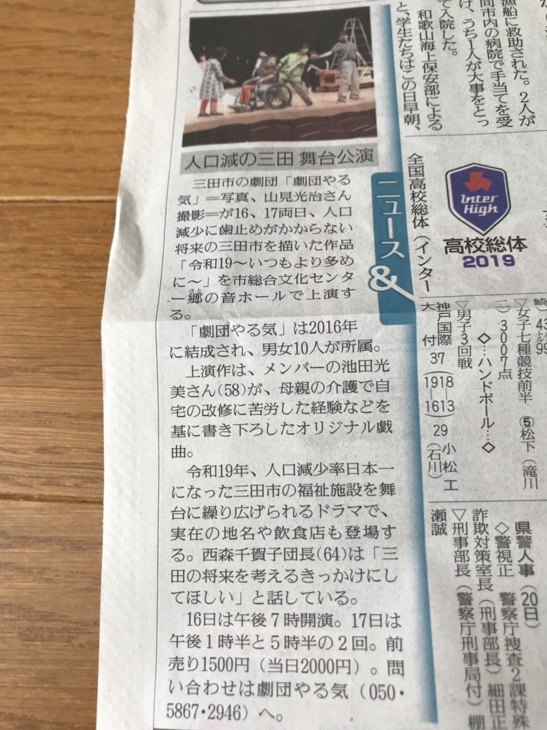 昨日は13:00からお稽古!もう芝居も追い込みなんですが、他の諸々も追い込み真っ最中です!!劇団やる気制作のヒラセトモキです!おはようございます!昨日は稽古場にパソコンを持ち込んで、稽古の合間にいろんな作業をやってました。今一番急いでいるのは当日お配りするパンフレットの校正作業。超タイトなスケジュールでデザイナーさんに動いてもらっているので、こちらもできるだけスムーズにやらないとーと思っております(^_^;)で、稽古中にコソコソと校正をし、ようやくこんな感じまでできてきました!まだ詳しくはお見せできませんけどね!(笑)今回のパンフは割とシンプルな作りなんですが、かわいく仕上がっていますよー(^^)そして今日もこれからお稽古なんですが、まだまだ校正作業は残っています。パソコン持ち込んでスキマ時間見つけてやっちゃいます!ところで!チケットはもうお買い求めになられましたか?まだお席余裕がありますので、お盆だしどうしよーかなーと思ってらっしゃったあなたはお早めにチケット確保をお願いしますね!劇団やる気のお電話にかけていただいても結構ですし、HPから申し込んでいただいても大丈夫です。もちろん郷の音ホールチケットセンターでも絶賛発売中です!!もう泣いても笑ってもあと5日!最後の最後までがんばります!!・・・チケット絶賛発売中です---劇団やる気 第3回公演令和19~いつもより多めに~日時 2019年8月16日(金)19:00~ 2018年8月17日(土)13:30~/17:30~会場 郷の音ホール 小ホール入場料 1500円(当日2000円)チケット販売 郷の音ホール チケットセンター(tel:079-559-8101) 劇団やる気(tel:050-5867-2946) 劇団やる気HP(https://gekidan-yaruki.wixsite.com/yaruki/) 主催 劇団やる気後援 三田市・三田市教育委員会・三田市観光協会