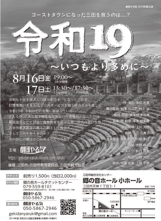 昨日の夜はビールちょっとだけ飲んだらダウンしちゃいました。劇団やる気制作のヒラセトモキです!弱くなったなぁ~(-_-;) さて、「令和19~いつもより多めに~」のチラシの裏にあらすじが載っているのですが、もうご覧になられましたか?今日のブログはあらすじをじっくり見ていこうという企画です。(あらすじの下に書いてある → で始まる文章は解説と追記です。)あらすじ令和も10年を過ぎ、人口減少率日本一となった三田市 → 三田市って、1985年から1996年まで人口増加率が11年連続日本一の町だったんです。「令和19~いつもより多めに~」でもそのあたりの話が出てきます。打開策無いままAI化で公共サービスを縮小統合するも虚しく令和19年、市制存亡の危機に直面している。→ タイトルの「令和19」はそのまま令和19年ってことなんです。今から18年後の未来の話なんです。そんな折、とある超多機能福祉施設の介護職員となったのは難民孤児として日本で義務教育を受けた第一世代の若い女性。→ さぁ、急に情報が増えてきました(笑)「令和19~いつもより多めに~」の舞台は超多機能福祉施設…要するに現代でいうデイサービス的な場所ですね。そこで働くことになったのが海外からの難民受け入れでやってきた若い女性だった、ということらしいです。若年労働者最後の頼みの綱として施設を、そして三田を救えるのか?市の存亡の鍵はどこにあるのだろうか?→ その女性を中心に、デイサービス的な施設の中である事件が起きます。そしてそれと並行するように令和19年の三田市が抱える市制存亡という大きな問題の解決策も探していくのでありました。あくまでもざっくりしたあらすじ紹介なので、全然よくわからないとは思いますが(笑)、自分たちの身の回りの話、そして自分たちが住んでいる地域や国の話まで広がるようなストーリーです。それに加え、これまでにも何度もお伝えしている通り、三田の町の名前や名所がたくさん出てくるのも見どころの一つなんです。さぁ、このあらすじ&解説でイメージ湧きましたでしょうか?もっとよくわからなくなったかも?(笑)気になられた方は、一日も早くチケットを入手してくださいね!・・クラウドファンディング実践中!ご支援お願いします!チケット絶賛発売中です---劇団やる気 第3回公演令和19~いつもより多めに~日時 2019年8月16日(金)19:00~ 2018年8月17日(土)13:30~/17:30~会場 郷の音ホール 小ホール入場料 1500円(当日2000円)チケット販売 郷の音ホール チケットセンター(tel:079-559-8101) 劇団やる気(tel:050-5867-2946) 劇団やる気HP(https://gekidan-yaruki.wixsite.com/yaruki/) 主催 劇団やる気後援 三田市・三田市教育委員会・三田市観光協会