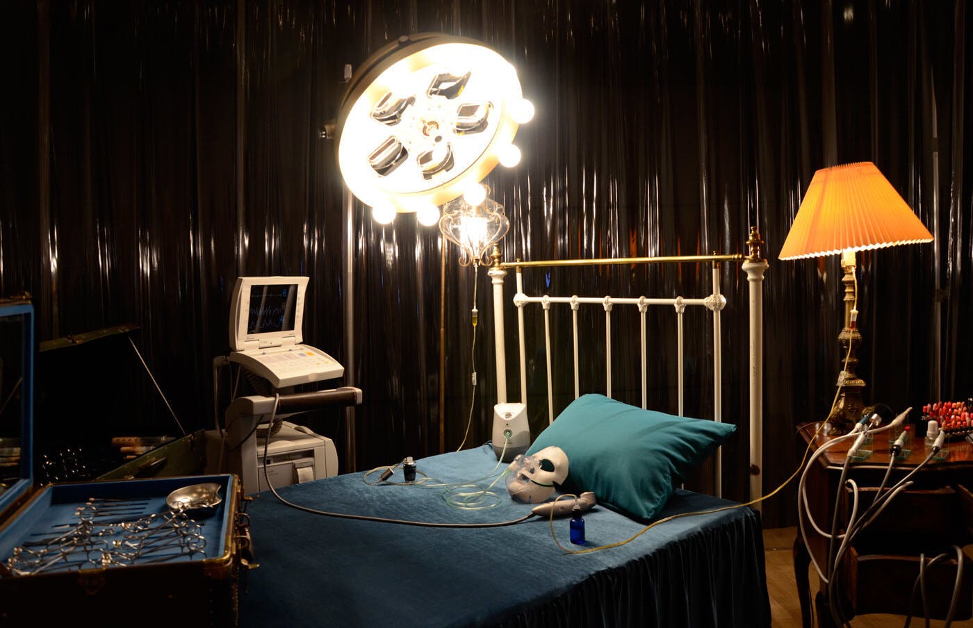 化粧品や美容家電などの美容のための道具と、医療のための手術道具、そしてアンティークの家具で構成された、まるでこれからオペが始まる手術室のような空間。