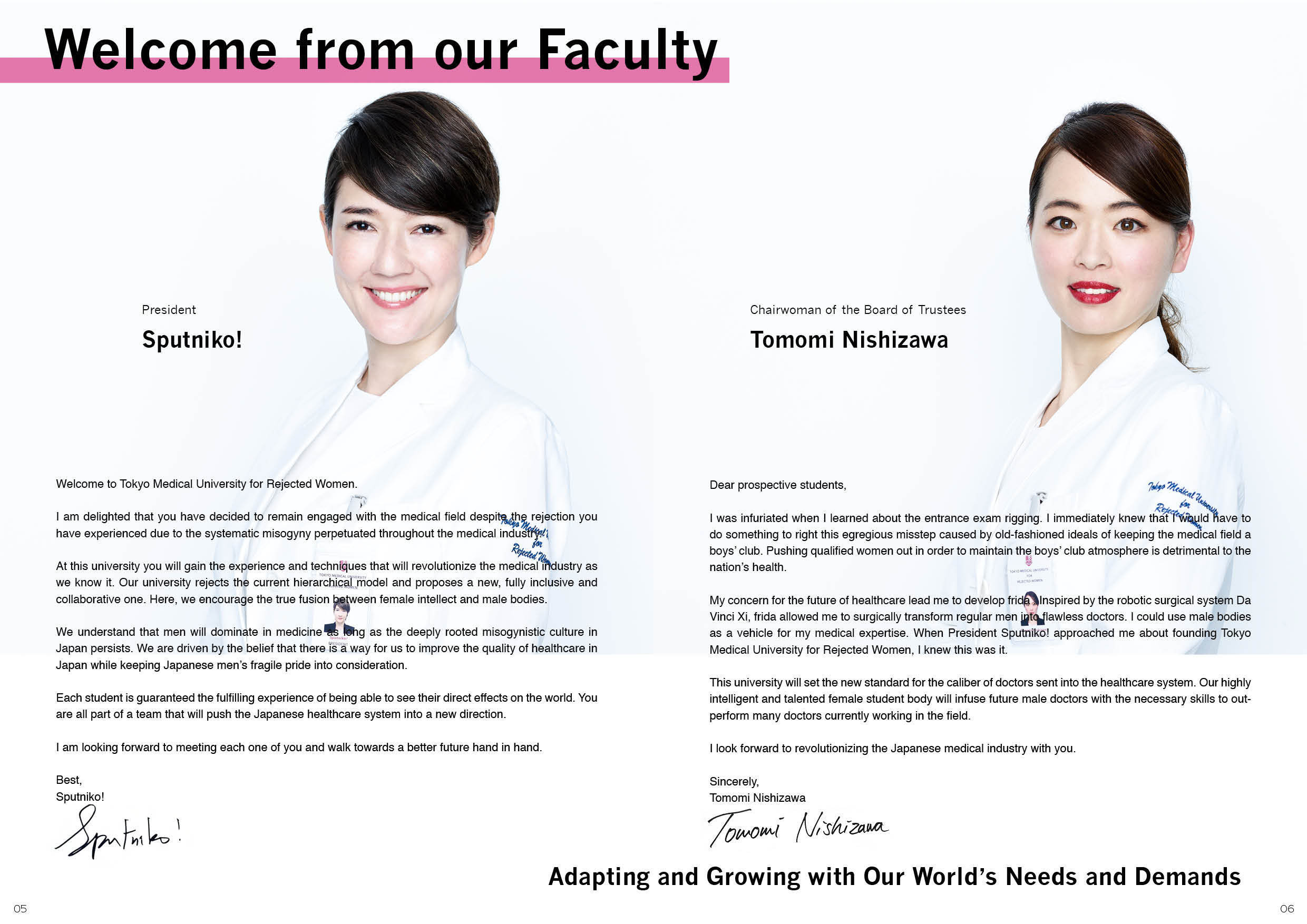 2018年8月、大学医学部の一般入試で、女子受験者の得点を一律に減点し、合格者数を抑えていたことが、日本のみならず海外のメディアでも大きく報じられました。「東京減点女子医大 - Tokyo Medical University for Rejected Women」は、その事実をモチーフに日本の女性差別問題を浮き彫りにすべく、アーティストであるスプツニ子!と西澤知美が設立した架空の大学です。