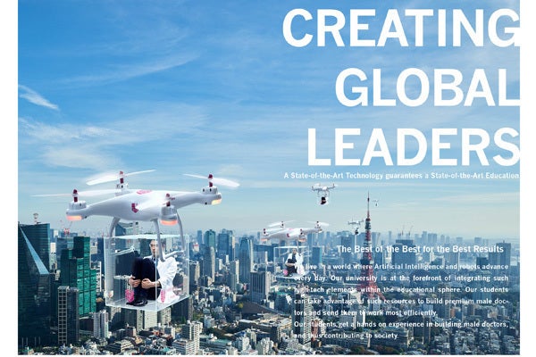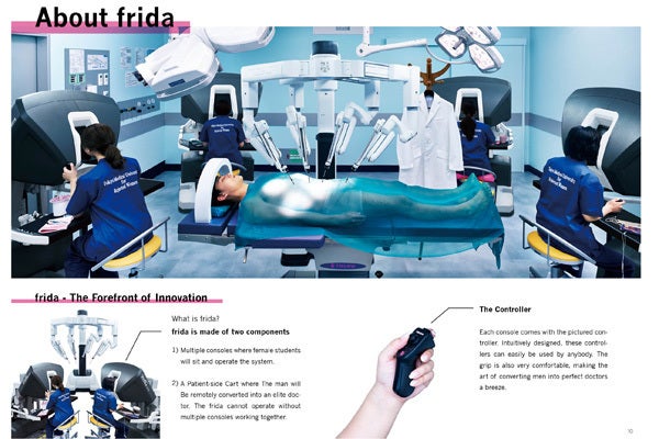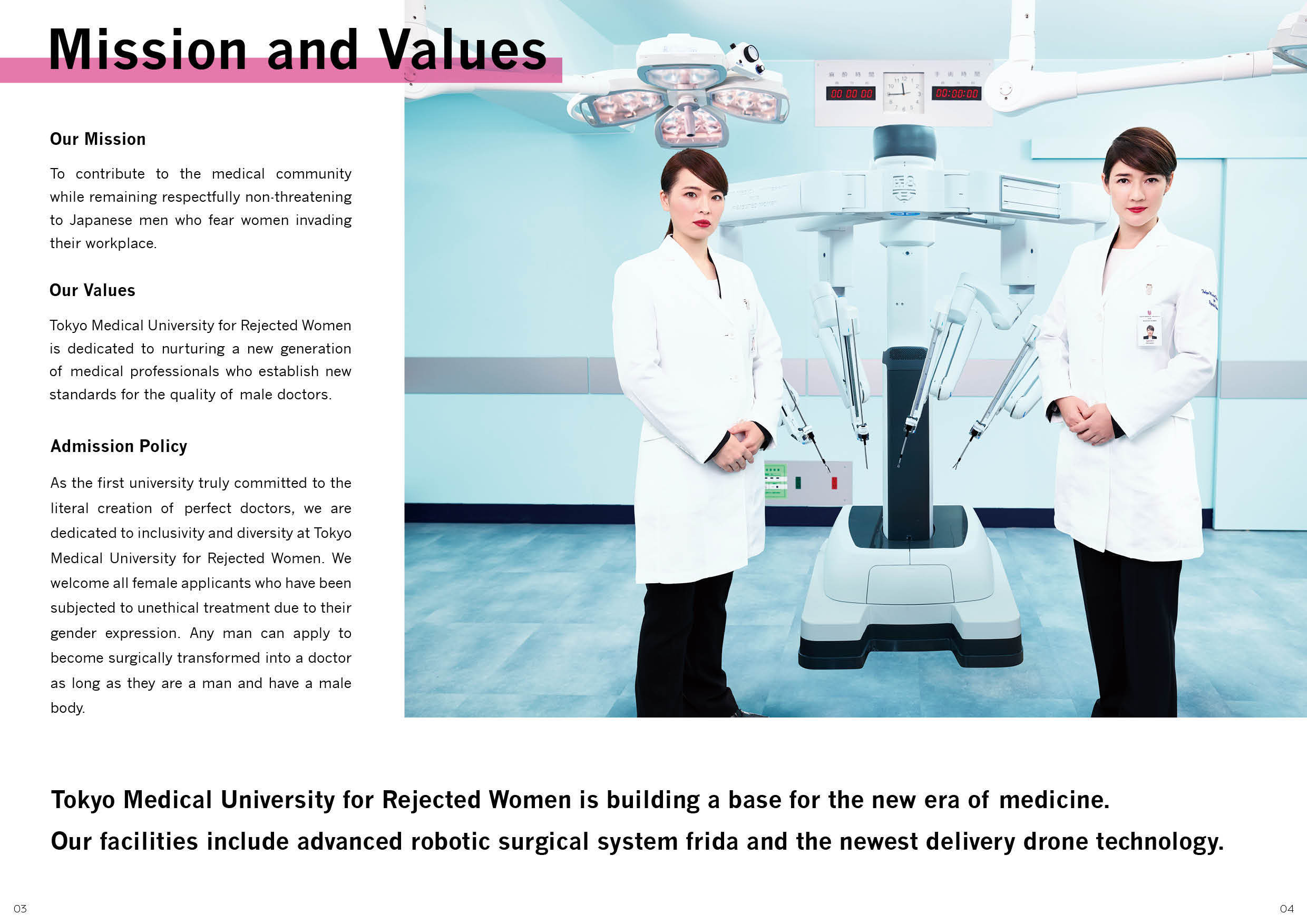 東京減点女子医大は、日本の医療界から排他されてしまった女性達による「結社」的な大学です。日本の医療界があまりに「男性の姿かたちをしたドクター」にこだわるため、女子学生たちは仕方なく一般男性を「無敵のエリート男性ドクター」に改造、つくりあげた「エリート男性ドクター」たちをドローンに乗せて日本各地の病院に配送します。これにより医大から減点・排他されてしまった優秀な女性達も、才能が無駄にならずに日本の医療界に貢献できる・・・!という皮肉と風刺をこめたブラックユーモア大学です。