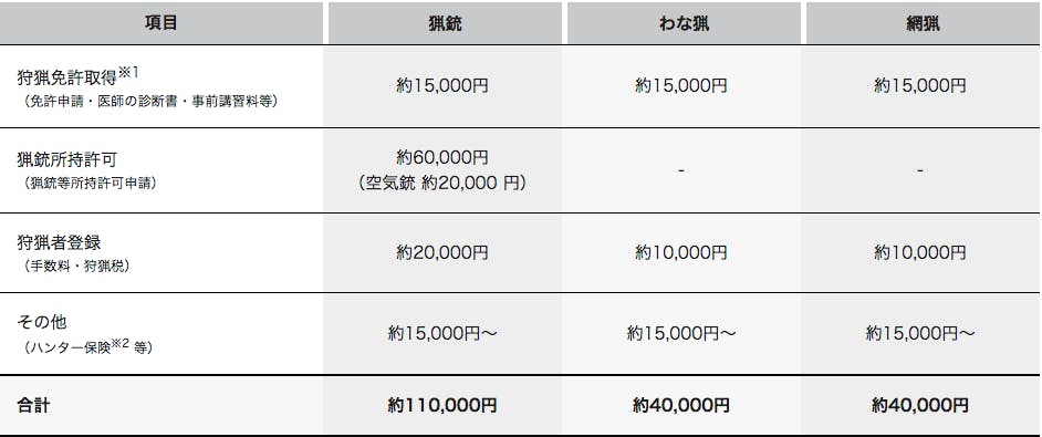 第一種狩猟免許の場合 +装備代(銃、弾、ガンロッカー等)約15万~