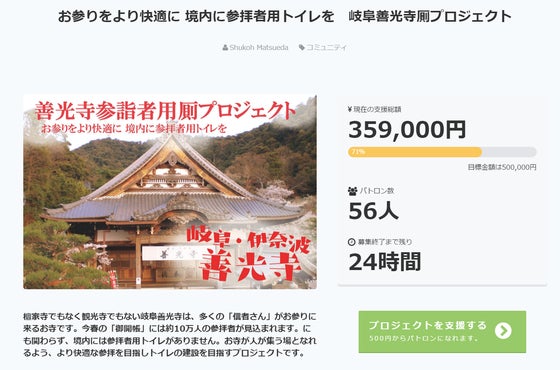 トイレ建設の総工費は500万円。このうち、50万円をCAMPFIREのクラウドファンディングで募りたいと希望しております。不足分は、寺の自己資金でまかないます。