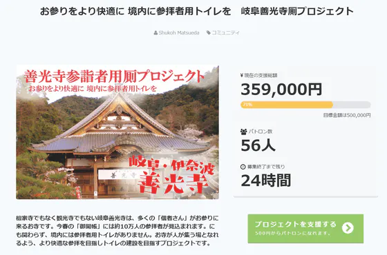 2015/04/25 17:37目標額達成! 多くの方々のご支援とご協力により、 最終日に目標額を達成でき、 無事にプロジェクトを成功させ、終えることができました。 プロジェクトを終え、ホッと一息つき、 ご報告が一日遅れてしまいましたこと、お許しください。 ご支援していただきました皆さまへのリターンの準備を進めながら、 参拝者用トイレの進捗状況を今後もご報告していきます。 お楽しみに。 まずは、お礼までとさせていただきます。 ありがとうございます。 合掌 もっと見る