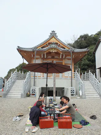 急きょピクニック気分で境内にて昼食を囲む様子です。