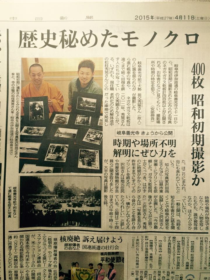 善光寺の庫裏(くり:お坊さん家族の住居)から出てきた、古い写真のネガ約400枚。それを親友である写真家澤田尚正氏(上の写真左側)に依頼し、約3年かけて現像してもらいました。写真は現住職の祖父であり第19世住職の秀猛(しゅうみょう)さん(戦死されたため、会った事はありません)が撮影したもの。