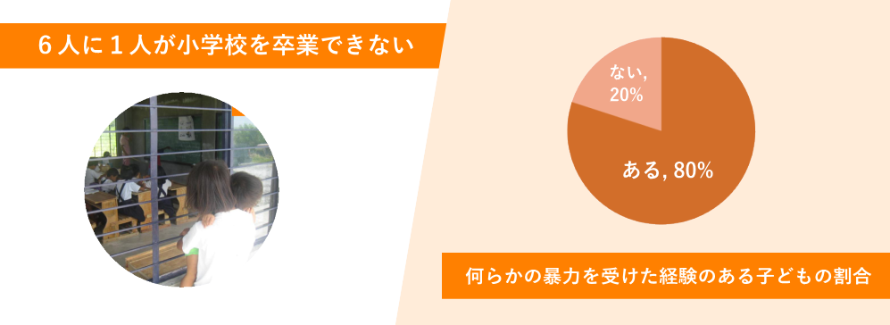 また、就学できたとしても、学校で体罰やいじめを経験したり、家庭内で虐待に苦しめられたりして、自分らしくのびのびと成長する機会を奪われている子どもたちがたくさんいます。2016年にUNICEFが発表した調査は、8割の子どもたちが「何らかの暴力を経験したことがある」と報告しています。