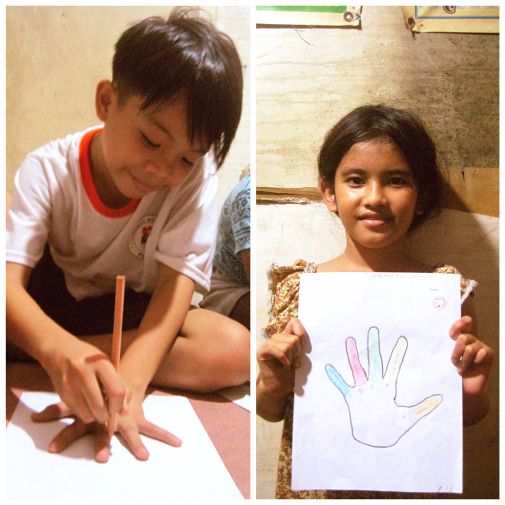写真は、手形に「自分の大切な人」を書き込み、みんなの前で発表するという補習授業の様子。絵を描いたり話し合う時間を多く設けた、楽しめる授業になっています。