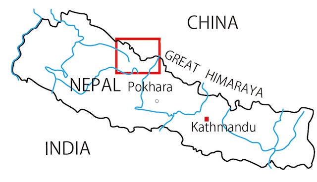 赤い部分で囲まれてる場所がドルポヒマラヤの高峰ダウラギリ連峰(8167m.etc)の西北に位置している。