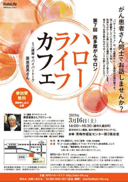 東京都の西多摩地区を中心に、がん患者さん・ご家族の、精神面や生活面のサポートを行うハローライフという団体です。2018年よりがん患者サロン「ハローライフカフェ」を1〜2ヶ月毎に参加費無料で定期開催しています。2019年7月には「がんになっても自分らしく生活するために」というテーマで講演会を開催します。