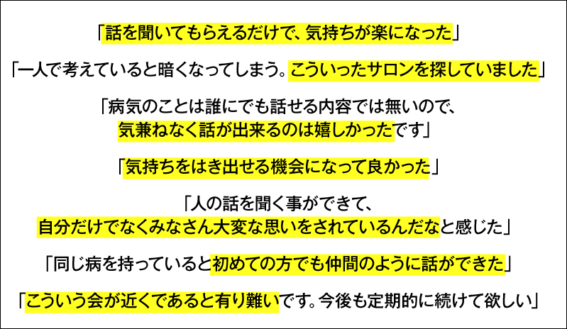 これらから、患者さんの気持ち・精神面をサポートしていくにあたり、ピアサポート(当事者同士のサポート)がとても有効であると感じました。引き続き気兼ねなく参加できる場所(サロン)を作って行けたらと思います。