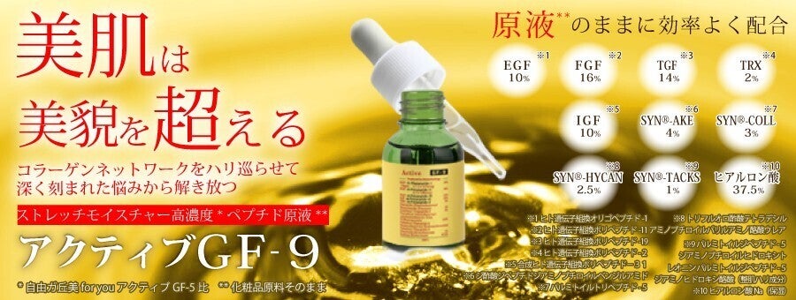 アクティブ型EGF原液美容液のパイオニアであります弊社が開発した贅を尽くした9種の原液美容液【アクティブGF-9】を単品で、リターンコースへ追加させていただきました。