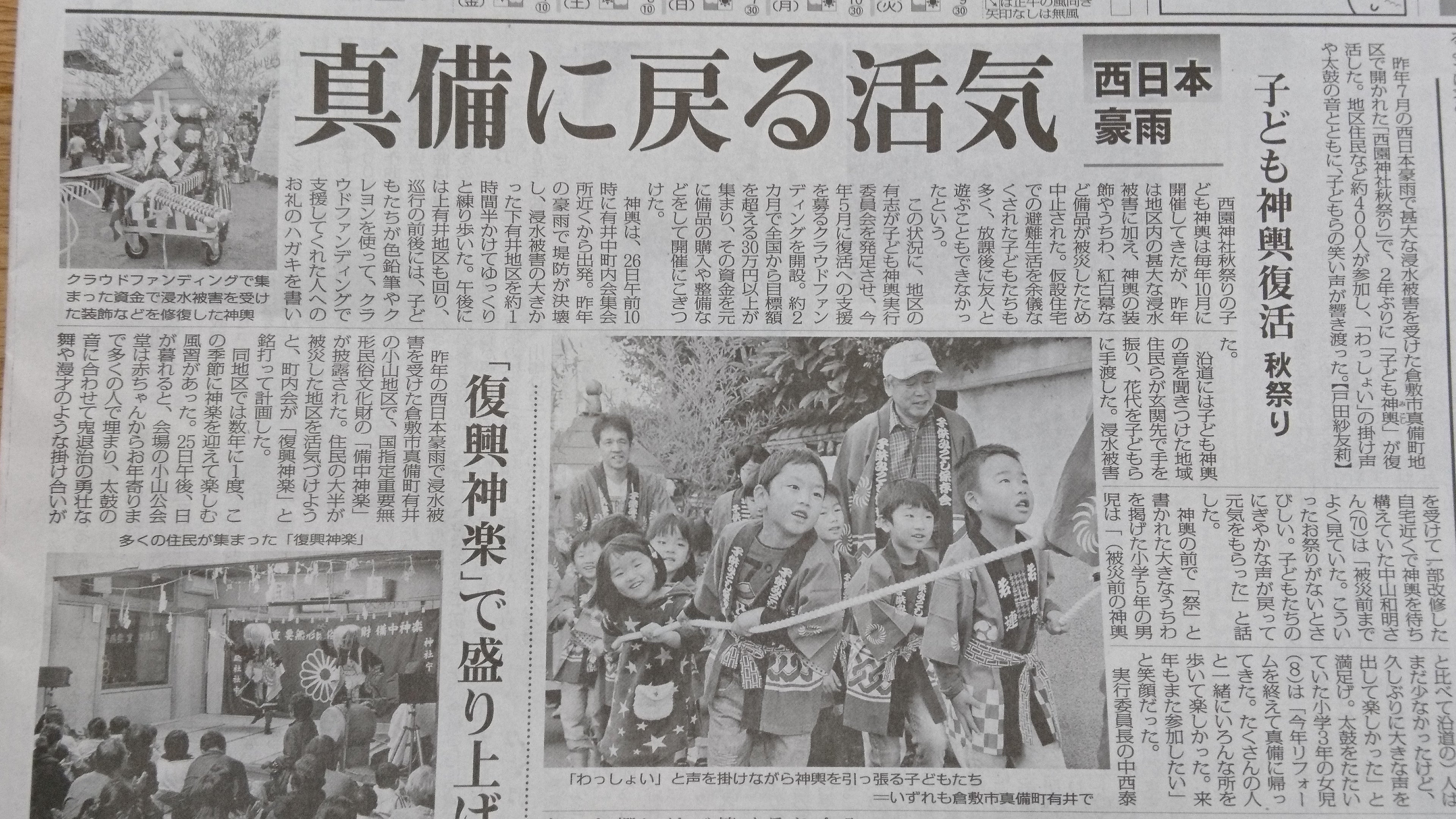 2019/10/30 17:05令和元年10月30日 毎日新聞 朝刊 岡山県版に、先日開催致しました「子供神輿復活祭」が掲載されました。記者の方が、地域の方や参加した子供などから得た声も掲載されており、私達実行委員は読んだ瞬間、胸が熱くなりました。今後は、リターン実行に向け準備を進めてまいります。実行は12月頃を予定しています。子供神輿実行委員会 もっと見る子供神輿開催のご報告