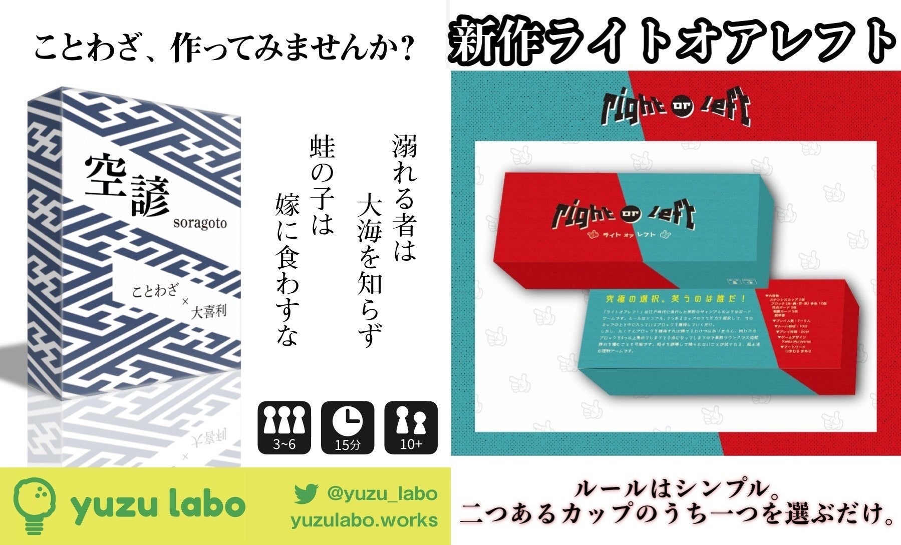 フォアシュピール2019秋に ことわざ大喜利ゲームの @yuzu_labo様と合同出店することになりました! 私達のブースでは2作連続で試遊して頂きます 計約45分という時間になるため、 5組の方々にしか遊んで頂けないでしょうが、楽しんで頂けるよう全力を尽くして皆様をお待ちしております!!! 空諺→http://gamemarket.jp/game/空諺/ ライトオアレフト→http://gamemarket.jp/game/right-or-left-ライトオアレフト/