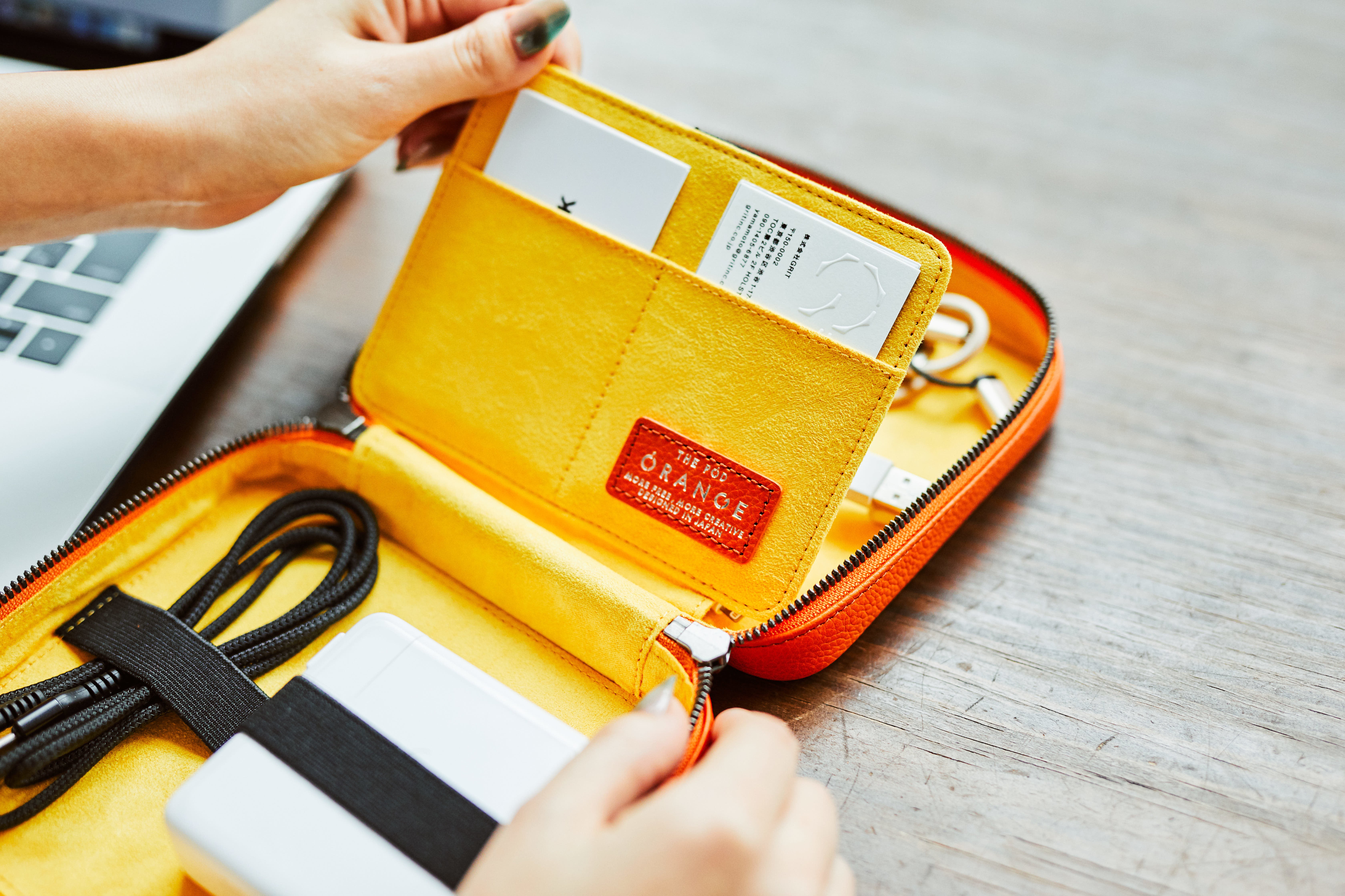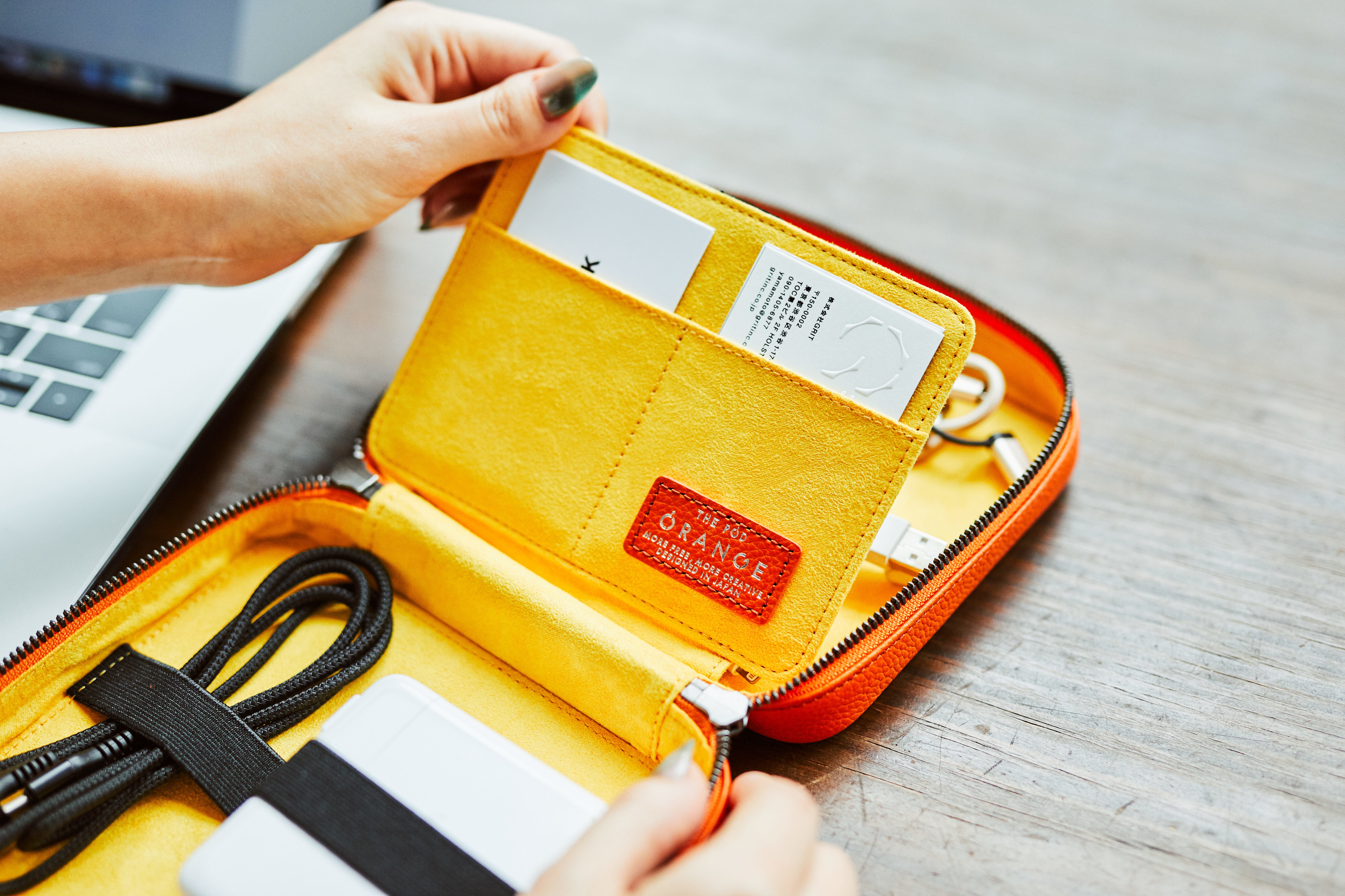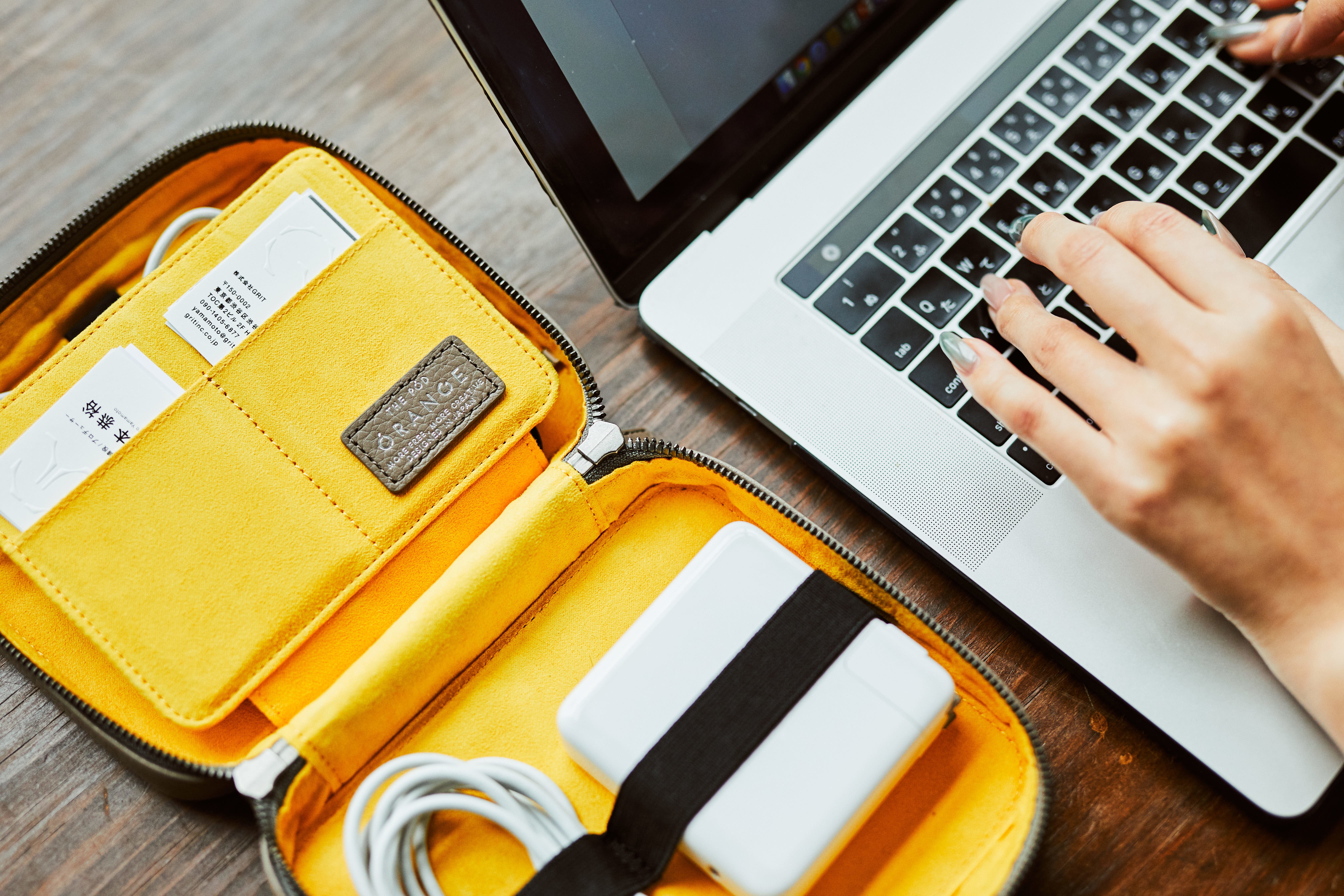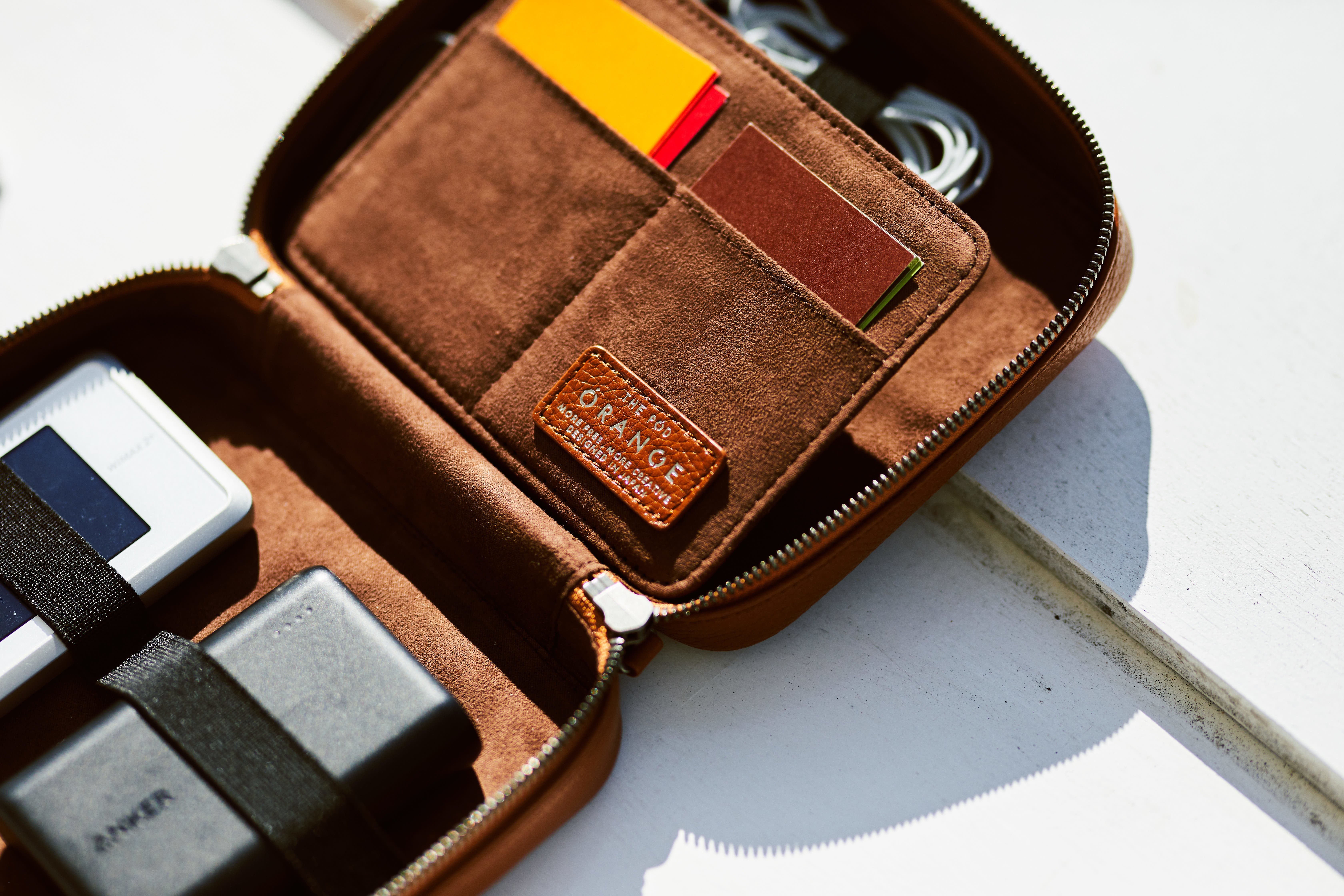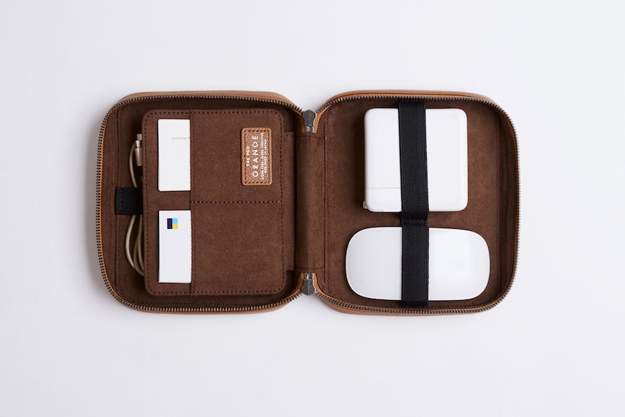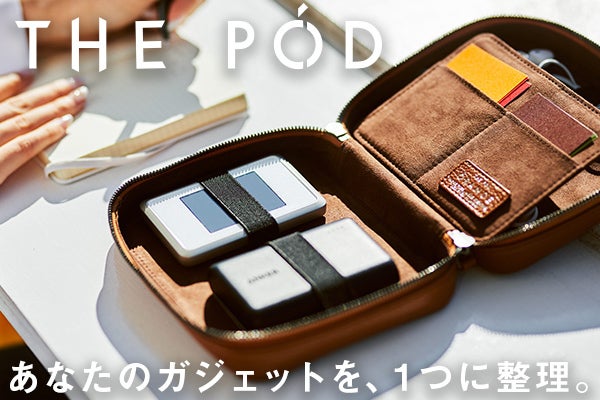 THE PODは、クリエイターが使うガジェットを1つに整理できるレザーポーチです。カバンの中で散らかりがちなケーブルや、充電器、ペンやメモを綺麗に収納することができます。