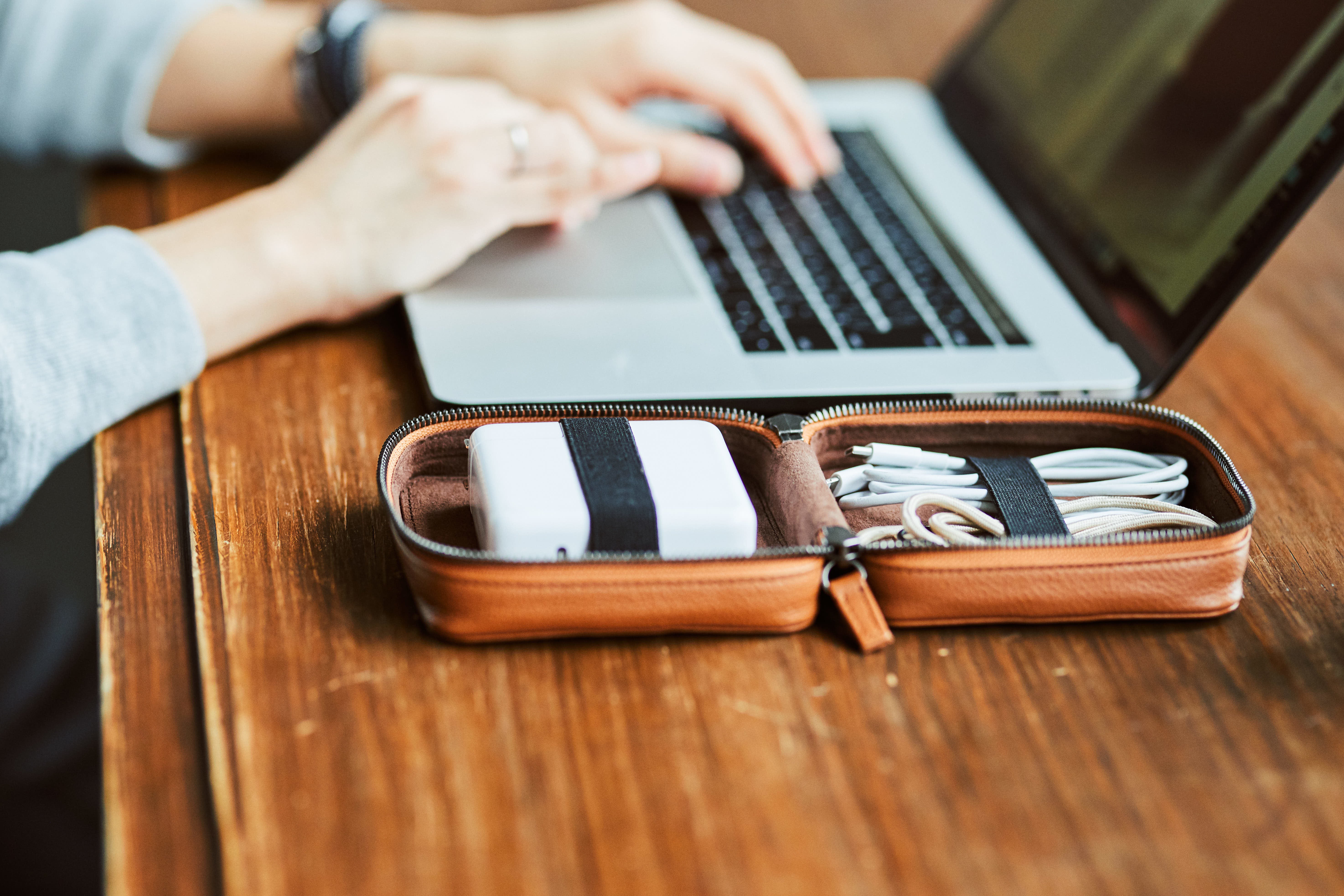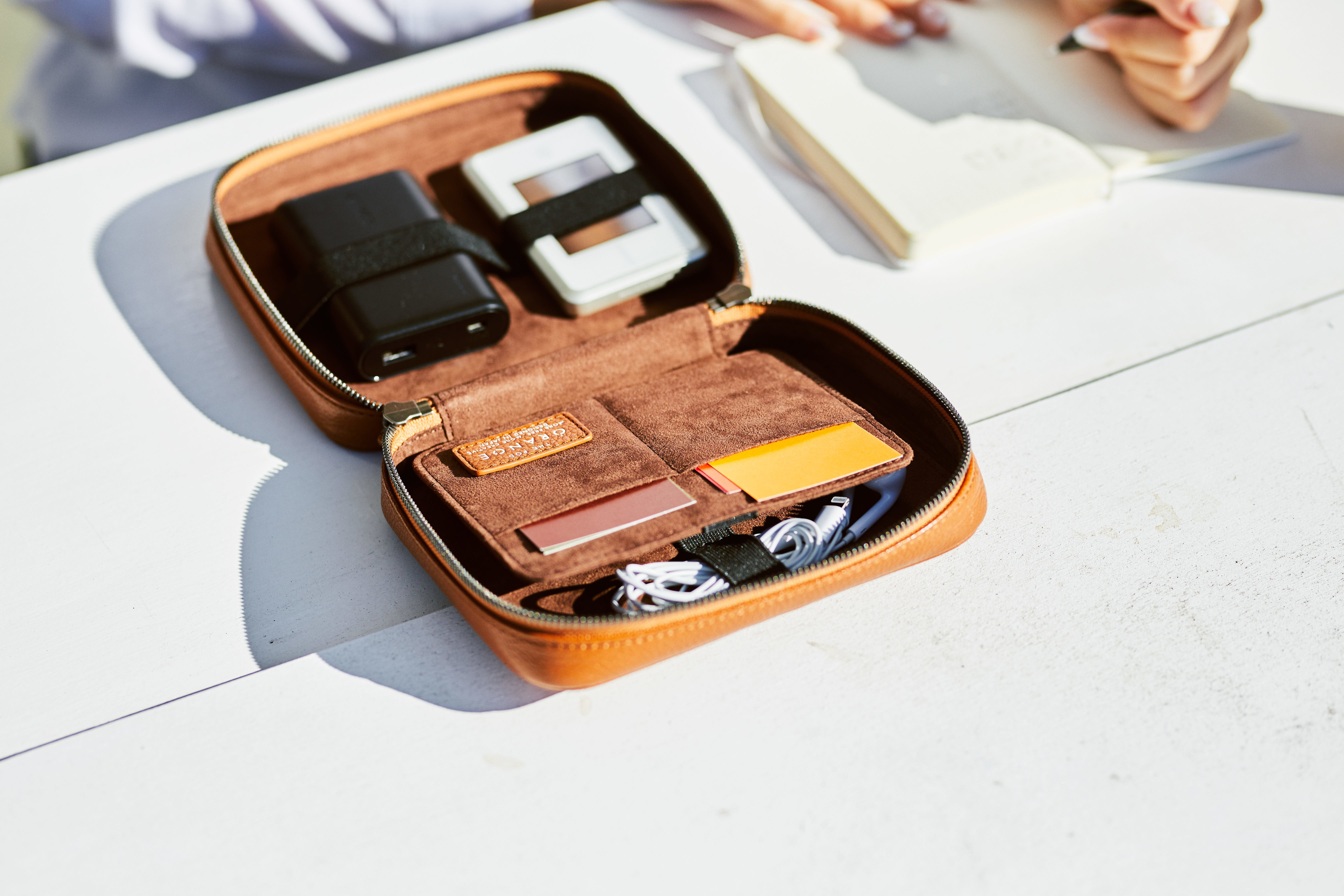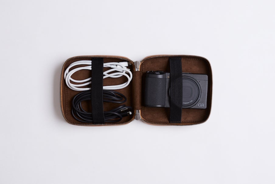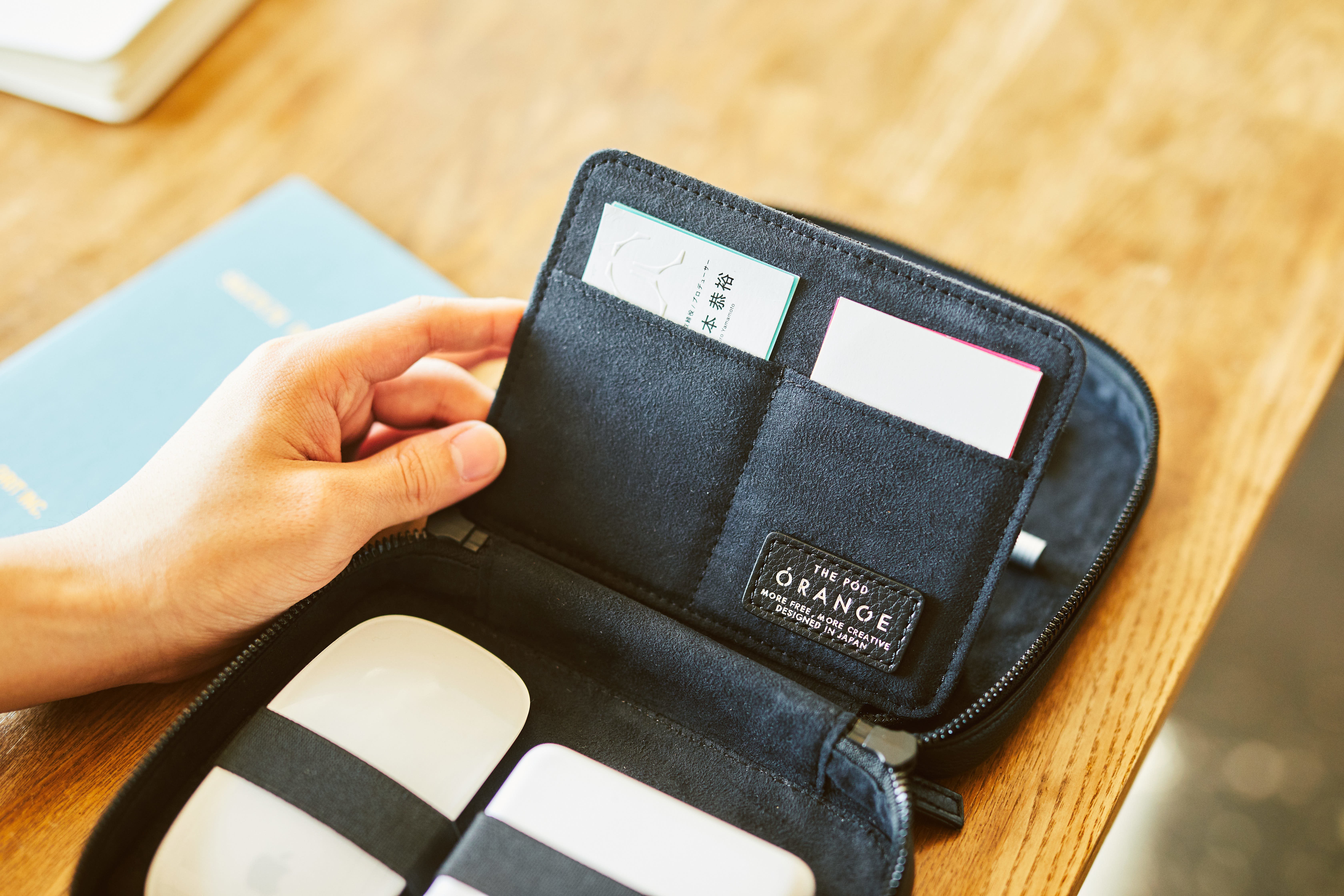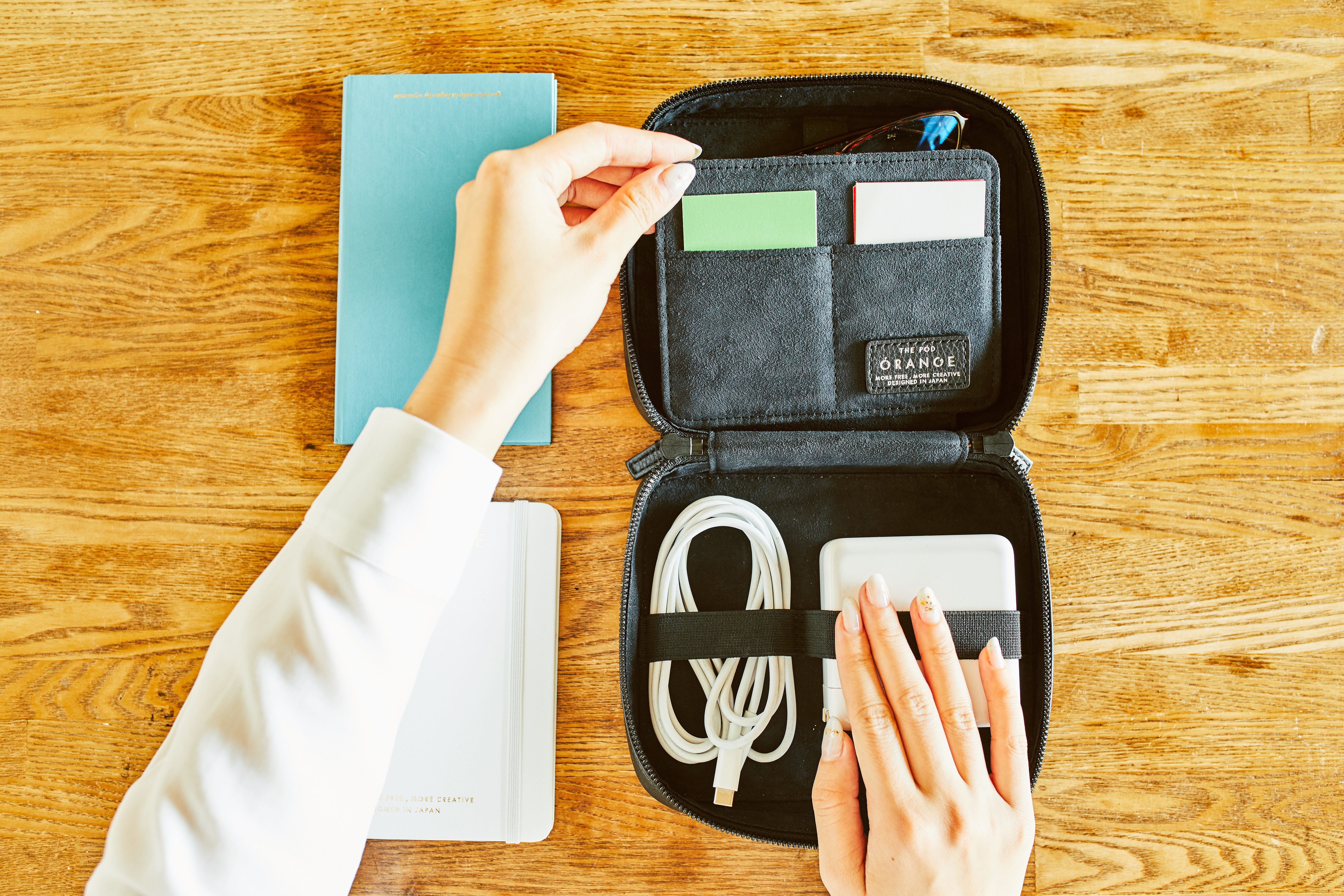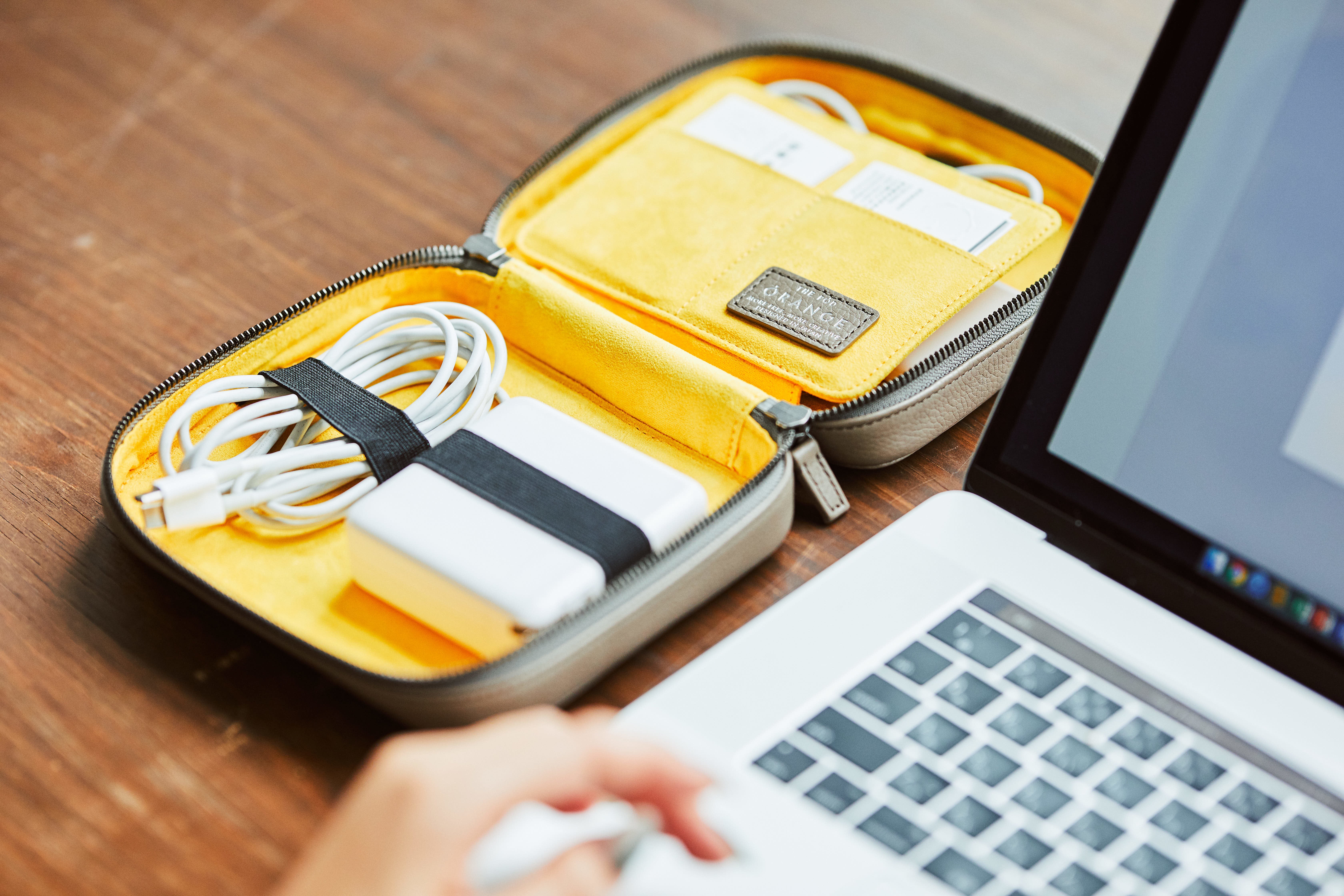 THE PODは、クリエイターが使うガジェットを1つに整理できるレザーポーチです。カバンの中で散らかりがちなケーブルや、充電器、ペンやメモを綺麗に収納することができます。